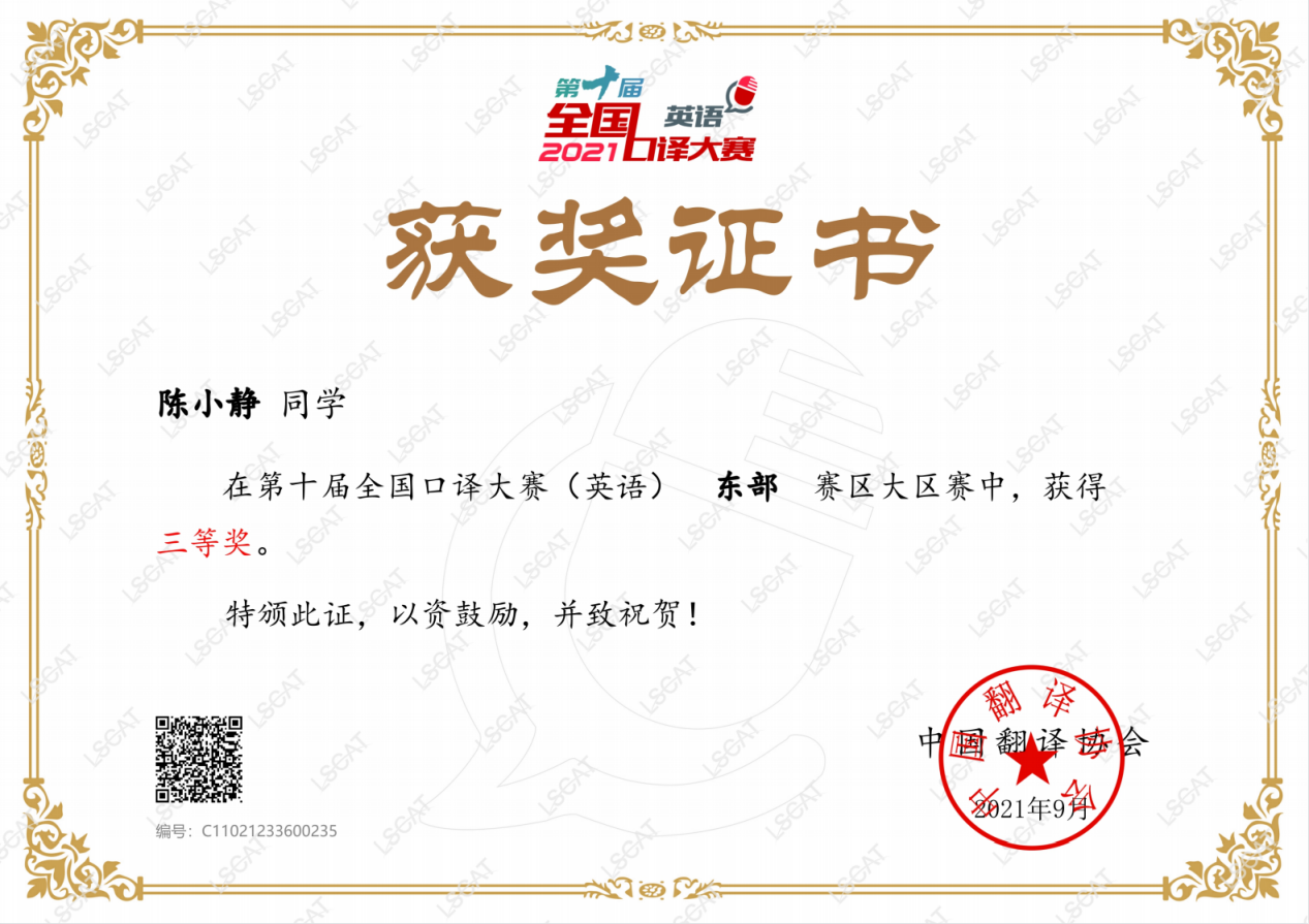 在老师的悉心指导和自己日复一日的练习下,陈小静的口译水平不断提高。在老师的鼓励下,她参加了第十届全国口译大赛,获得了东部赛区三等奖。这份奖项虽不算高,却给了她极大的信心,让她在专业学习的道路上愈挫愈勇。她认为,学习并无巧,坚持最重要,了解再多的技巧都不如坚持不懈地练习,特别是对于语言专业的学生来说:一天不练嘴巴慢,三天不练丢一半,一周不练门外汉,再不练只能瞪眼看。