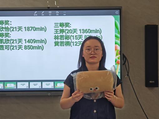 在21天读书打卡中,同学们用行动诠释了“书山有路勤为径”的精神。2024级屈欣怡同学获得一等奖,2024级杨凯欣、魏昱可同学获得二等奖。现场为到场的获奖同学颁发奖品,以示表扬和激励。