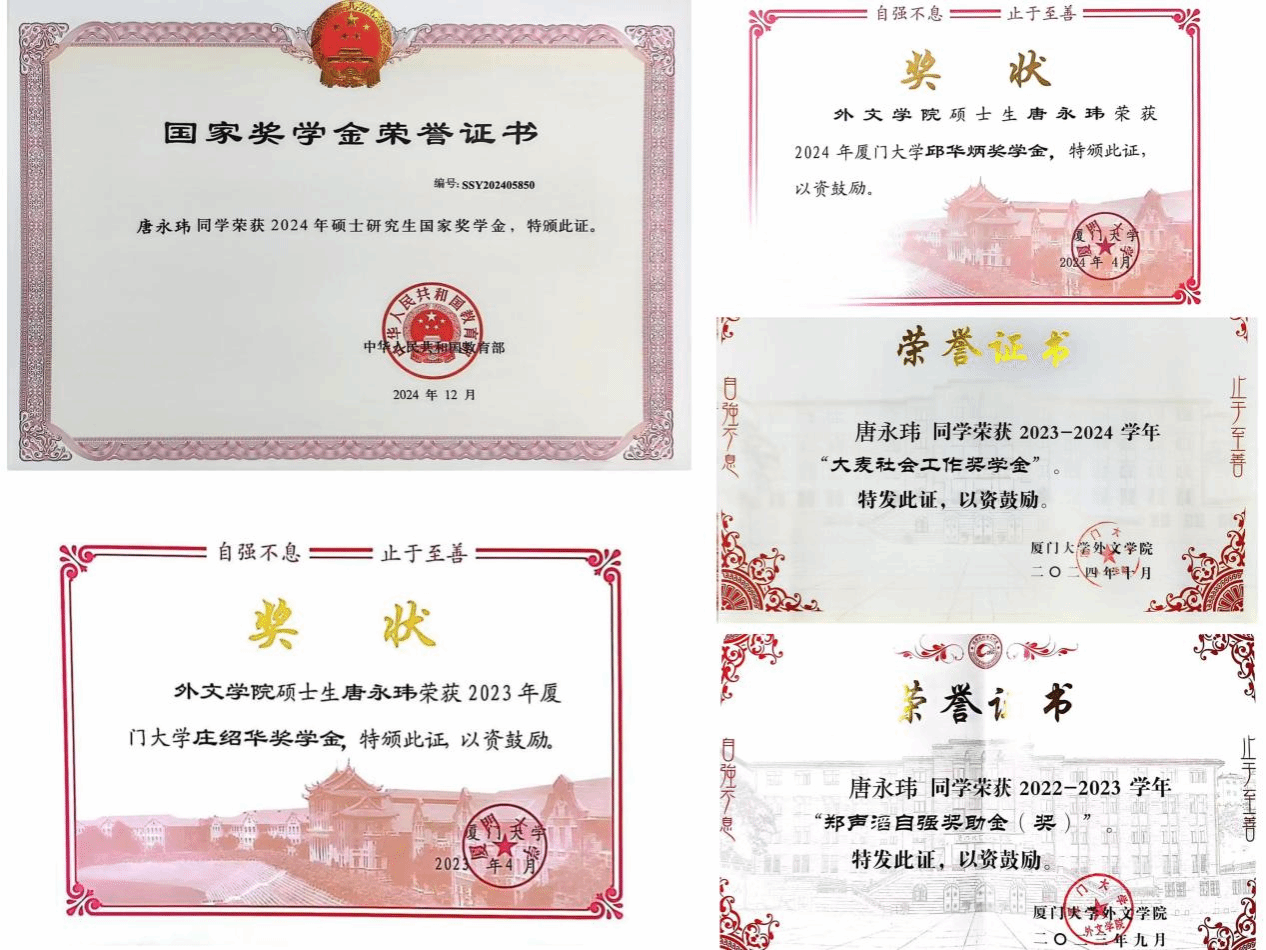 唐永玮,中共党员,外文学院2022级日语笔译专业硕士研究生。在校期间任外文学院研究生会执行主席、班级班长、党支部宣传委员、厦门大学“扬才班”文案写作组组长。曾获研究生国家奖学金,厦门大学庄绍华奖学金、邱华炳奖学金,外文学院郑声滔自强奖助金、大麦社会工作奖学金,荣获厦门大学“优秀三好学生”“优秀共青团员”“优秀学生干部” “优秀院研究生会主席”等称号。