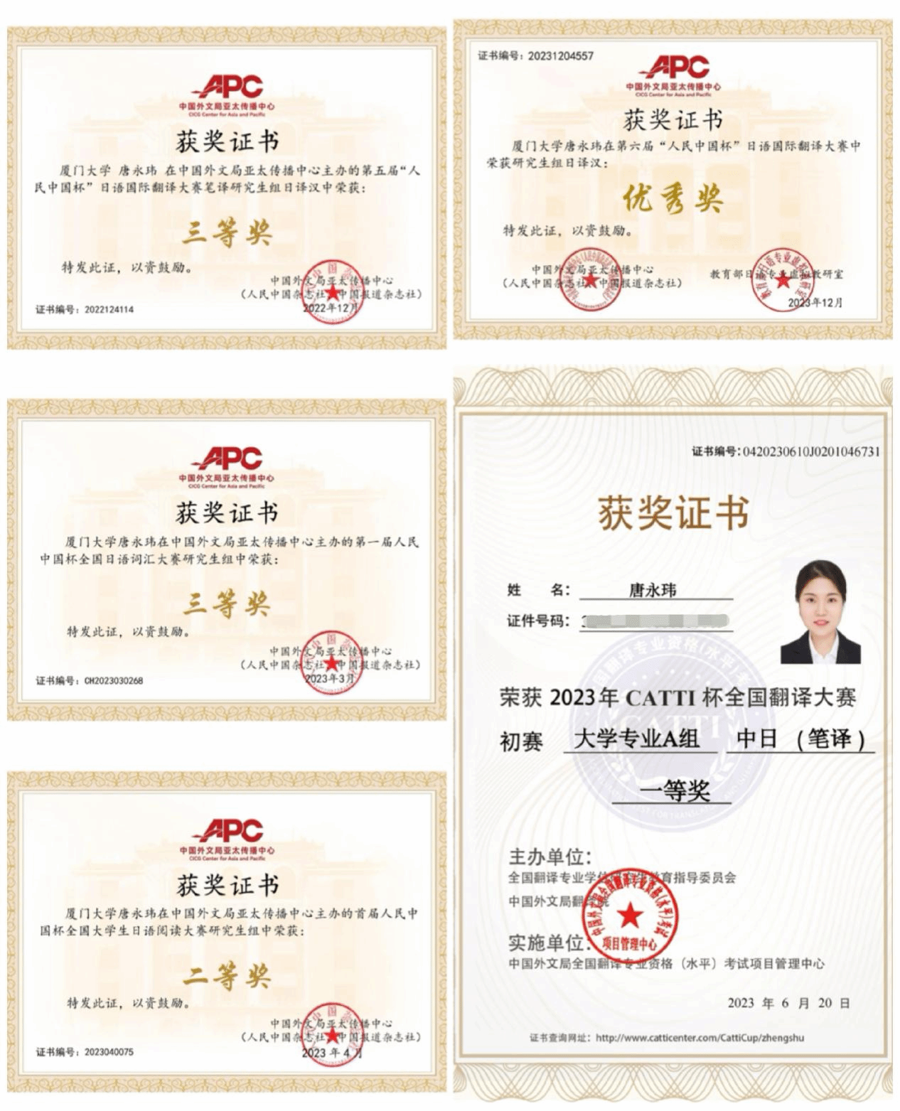 课业之余,她还积极参与学科竞赛和专业实习,于“人民中国杯”日语国际翻译大赛、全国日语词汇大赛、全国大学生日语阅读大赛等国家级赛事中屡获佳绩;曾在中国外文局亚太传播中心、山东省泰安市外事办等地实习,期间负责邀请函和会议讲稿等文书资料的翻译校订、日本友城青少年访鲁交流营接待等工作,在实践中锤炼了过硬的专业应用技能。