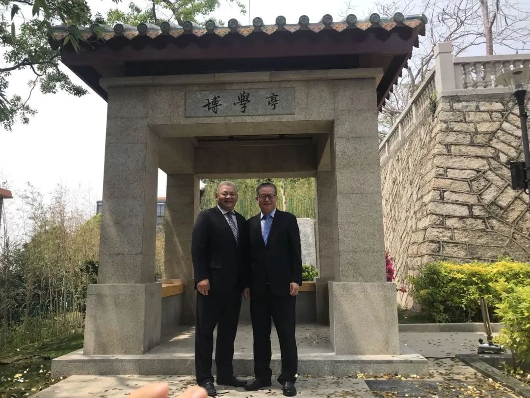 上个世纪八十年代,外文学院的教学区域在博学楼,为纪念这栋朝夕相伴四年的教学楼,外文学院85级校友们将奖学金命名为“博学”奖学金。外文学院教学区域迁到德贞楼后,学校拟在德贞楼前修建一座亭,同样源于对博学楼的情怀,朱群建议将亭命名为博学亭。亭一落成,几位85级外文校友纷纷发挥所长,集思广益,从精挑细选题板材料到为碑亭题写亭记,博学亭的每一处,都蕴含着他们的细致用心。每年四月,博学亭旁红火的三角梅浓烈地盛开,亭碑上的亭记在光的氤氲中熠熠生辉。这座博学亭凝结着包括朱群在内的85级校友对外文学院建设发展的深切关怀和热心支持。花开亭立,傍海向阳,都是满满的生机和希望。“博学奖学金不会停,我们会一直支持下去!”朱群坚定地承诺。