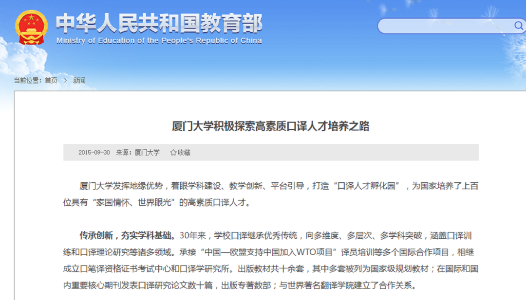 团队将融入职业伦理、厚植家国情怀放在人才培养的突出重要位置,通过“警务口译”、“手语翻译”、“口译工作坊”等常设课程和“联合国译员素养”等小学期选修课程,强化学生的职业敬畏、国家意识和弱势群体关爱意识。厦大口译方向硕士生高昕主持的,以关爱弱势群体为特色的“手望”手语翻译志愿服务项目于2015年12月代表福建省在第二届中国青年志愿服务项目大赛中斩获金奖,也是厦大在该赛事的最高奖项。