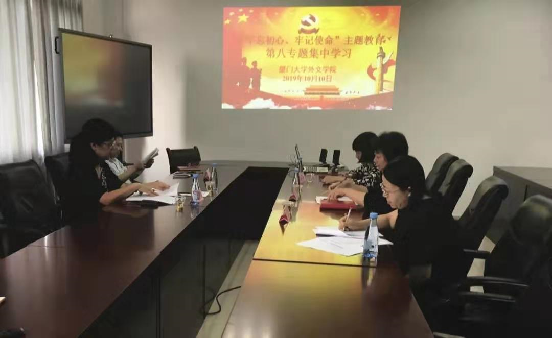 10月10日晚上,外文学院党员领导干部在德贞楼524围绕“严格廉洁自律”专题开展了“不忘初心、牢记使命”主题教育集中学习研讨。党委书记陈志伟主持学习会,党委副书记杨云良、沈丽秀,党委委员、副院长徐琪、辛志英参加学习。