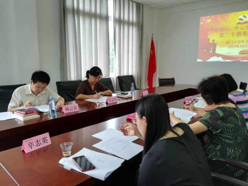 10月7日上午,外文学院党员领导干部在德贞楼524围绕“全面从严治党”专题开展了“不忘初心、牢记使命”主题教育第二次集中学习研讨。党委书记陈志伟主持学习会,学院党委副书记杨云良、沈丽秀,党委委员、副院长徐琪、辛志英参加学习。