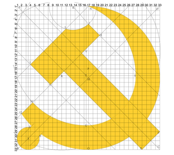 3.镰刀的画法:以M点(17、17′)为圆心、MN(N点为17、1′)为半径画弧NO(O点为17、33′);以P点(17、15′)为圆心、PO为半径画弧,与HG的延长线交于Q点;以R点(11、16′&17′中点)为圆心、RN为半径画弧,与通过R点的水平线交于S点;以T点(16&17、16′&17′的中点)为圆心、TS为半径画弧,与通过T点的垂直线交于U点;以V点(16&17、11′中点)为圆心、VU为半径画弧,与HG的延长线交于W,构成镰刀。以X点(3&.4、30′&31′的中点)为圆心作圆与AB、BC线相切,从Y点(6、30′)、Z点(4、28′)分别作直线平行于BD,构成镰刀把。