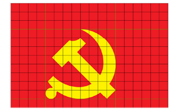 2.画旗面长与宽中线将旗分成4等分的长方形,左上方长方形内划出横18竖12等分的小方格。党徽图案切于8×8小方格的正方形内,正方形的上部与旗上边空3格,左侧与旗左边空4格。