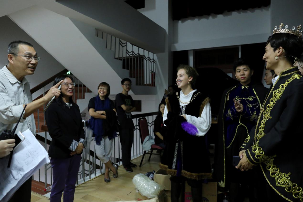 本届“外文好戏”自筹办伊始便得到了学校、学院各级领导老师的大力支持和悉心关怀。复旦大学外文学院张冲教授,厦门大学外文学院英语系主任杨士焯教授、英语系苏欲晓教授作为英语剧组《一报还一报》的指导老师,在剧本的选定和分析、台词和背景的释义讲解以及剧目的实地排练等各方面都给予了大量细致入微的指导。本剧扣人心弦的音乐、细致考究的服装、美轮美奂的舞台效果也离不开剧组幕后人员的辛勤付出。演出结束后,《一报还一报》的两位学生导演——来自外文学院的2016级硕士生刘畅和李柯影激动地对现场观众说道:“最想说的两个字就是‘感谢’,是老师们的悉心指导、演员们的积极配合、幕后人员的默默付出以及观众们的热情鼓励让演出获得成功!”