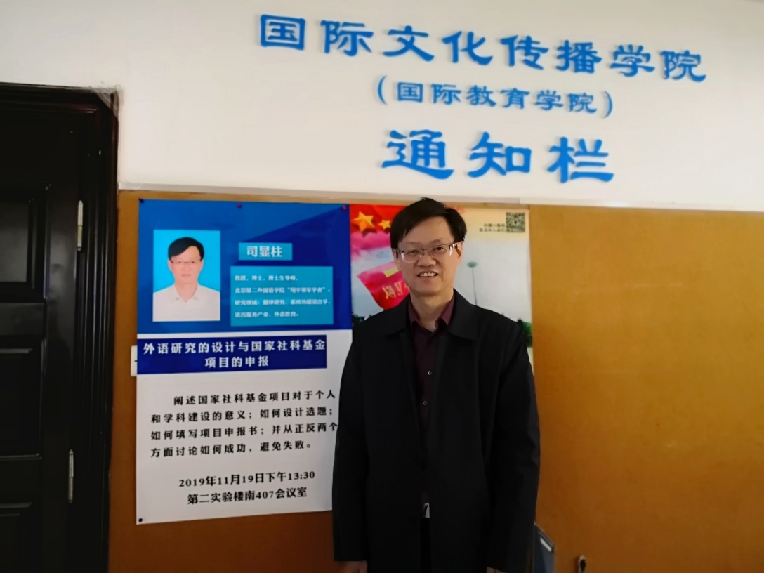司显柱,安徽六安人,博士,北京第二外国语学院“翔宇领军学者”,博士生导师。研究领域:翻译研究、系统功能语言学、语言服务产业、外语教育。出版、发表各类成果130余项,包括研究论文100余篇,出版专著11部、主编教材、编著等20余部;获省级科研、教学成果奖7项,主持并完成包括国家社科基金一般项目、教育部人文社科基金项目、北京市社科基金重大项目,以及教育部教学改革专项和其他省、部级社科课题10多项,目前正主持2018年度国家社科基金重点项目“提升我国对外新闻话语翻译与传播效果的多学科研究”和2019年度北京市社科基金重大项目“中外学术话语对比与对外翻译策略研究”。主要兼职:国家一级学会中国英汉语比较研究会副会长、中国英汉语比较研究会语言服务研究专业委员会会长、2013-2018年度教育部高等学校英语类专业教学指导委员会委员、教育部普通高等学校本科教学审核评估专家、中国译协翻译教学与翻译理论委员会委员、国家社科基金通信评审专家、国家社科基金成果鉴定专家、教育部和北京市社科基金评审专家、教育部“长江学者”人才工程项目评审专家等。