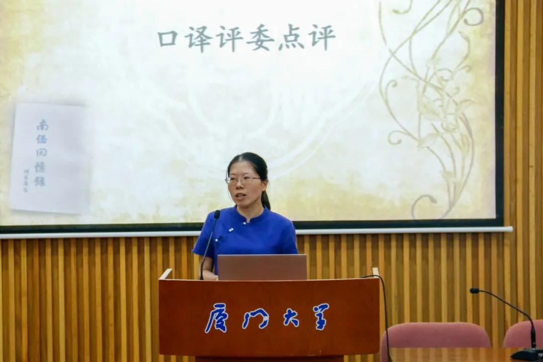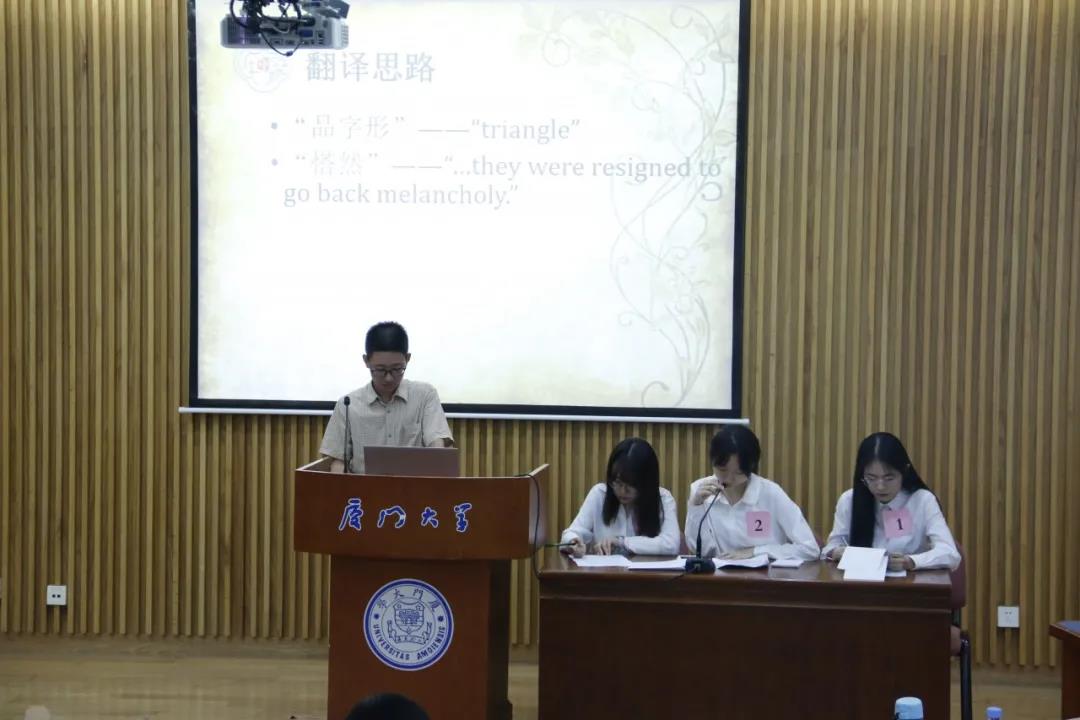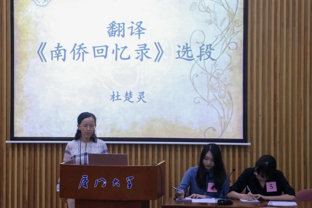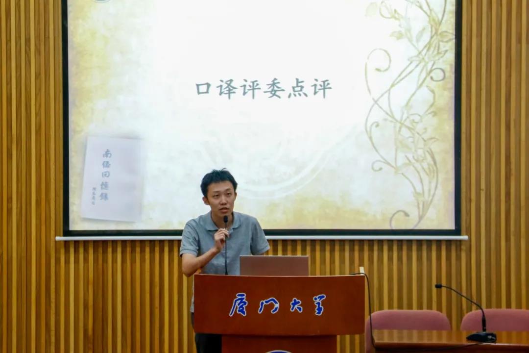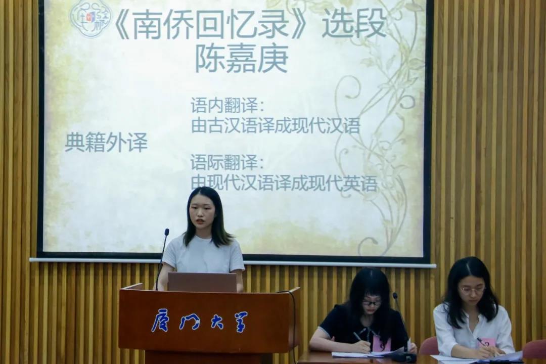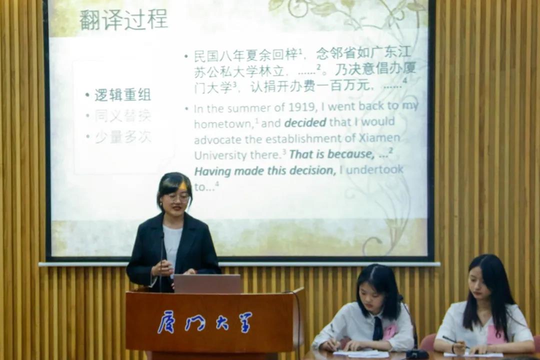第四位展示者——外文学院2019级英语笔译专业研究生袁晓丹同学对原文文本进行了分析,表示语内翻译与语际翻译的结合给译员一定程度上增加了翻译难度。袁晓丹同学还分享了本次比赛的心得:“在这次翻译大赛中,我感受到了陈嘉庚先生‘毕生以诚信勤俭办教育’的信念,也体会到译者作为读者和原文化之间沟通的桥梁,在翻译典籍时要增强文化自信、讲好中国故事,使中华文化真正走出国门、融入世界。”王瑾涵、郭文婷负责本组交替传译。