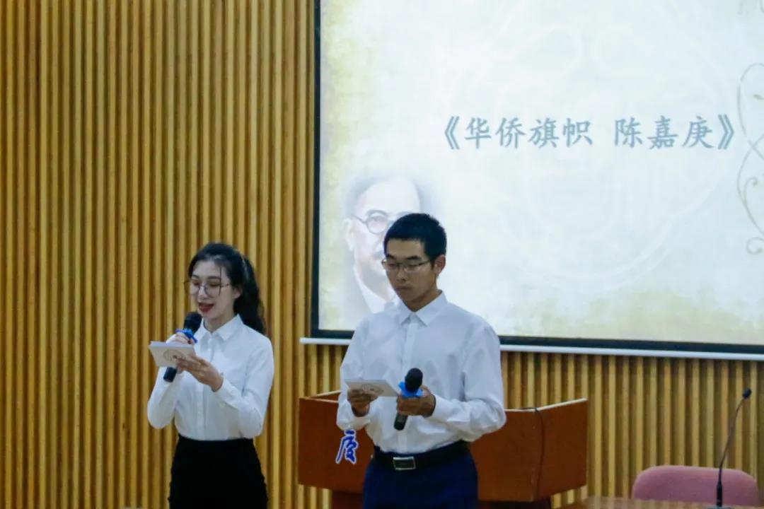2020级俄语+会计学/财务管理专业本科生董宁和日语专业本科生黄宇鑫深情朗诵《嘉庚颂》,向校主嘉庚先生致敬,赢得了在场师生的热烈掌声。