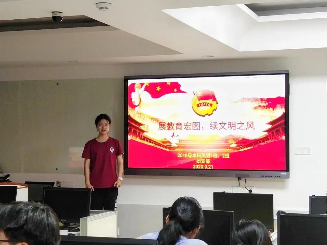 新学期伊始,为引导广大同学尽快调整学习状态,凝聚提振精气神,激发担当作为新活力,921日下午,外文学院以团支部为单位,组织全院学生开展了“展教育宏图  续文明之风”政治理论学习,进一步坚定理想信念,弘扬主流价值,滋养文明风尚。
