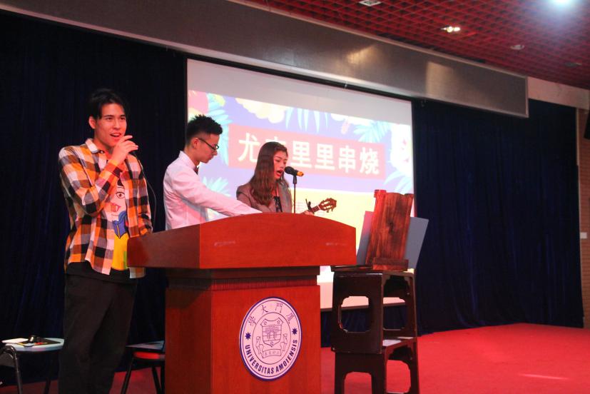 到了第二个互动环节——“击鼓传花”。主持人背过身播放音乐,在座的同学依次传递信物,乐声止而信物在手者,收下信物作为奖品,同时接受挑战,过程中现场欢乐不断。