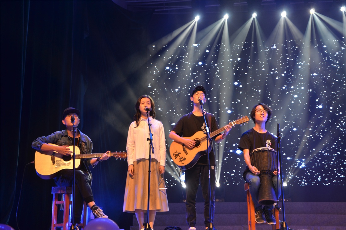 在BLINKY乐队的暖场表演后,晚会正式拉开帷幕,进入第一篇章“十八岁的青春,一串风铃”。首先登场的Rubato人声乐团带来了阿卡贝拉表演《Somebody that I used to know》,整齐而富有层次感的人声配合与黑白色调的衣着完美融合。由外文、法学和信息学子联合演奏的《钢琴、弦乐与管乐的对话——新海诚动画主题曲合奏》呈现了钢琴、低音提琴、小提琴、长笛、吉他与电子合成器完美的交汇融合,使合奏既有不染尘埃的优雅,又带有温暖人心的烟火气。