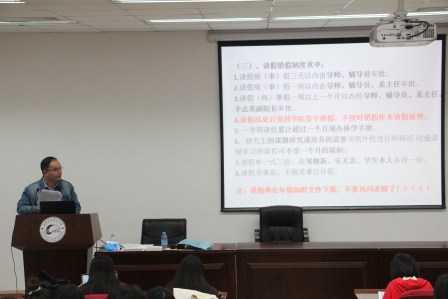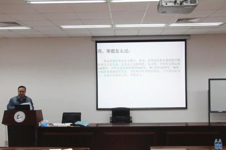 大会伊始,乐老师提醒同学们要了解和熟悉各位院系领导、老师的职能分工,掌握相关联系方式,学会积极、主动与老师们沟通。接着,乐老师要求大家牢记放假离校及返校报到时间,严格执行请销假制度,提前离校、无法按时报到须履行请假手续。寒假、春节临近,乐老师特别指出“安全无小事”,同学们假期务必注意安全,遵守法律法规,加强自我防范和保护意识;留校同学要服从学校、学院的安排和管理,互相照应,确保宿舍用电安全、消防安全。随后,乐老师结合我院往届研究生就业情况及2018、2019届研究生的最新就业情况,向同学们展示、分析了学长学姐们的就业去向及区域分布等数据,为同学们提供求职参考,希望大家能找准职业方向,提前规划,做到胸中有数。最后,乐老师对毕业班和非毕业班同学分别提出希望,希望毕业班的同学能好好把握最后一个寒假,合理制定假期计划,按时完成毕业论文,积极主动择业;非毕业班同学做到未雨绸缪,早日规划,利用假期多学习、多做事、勤沟通,提升自己各方面的能力和素质。