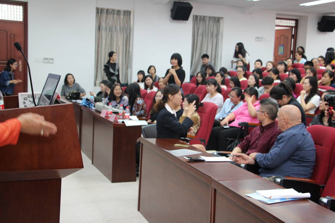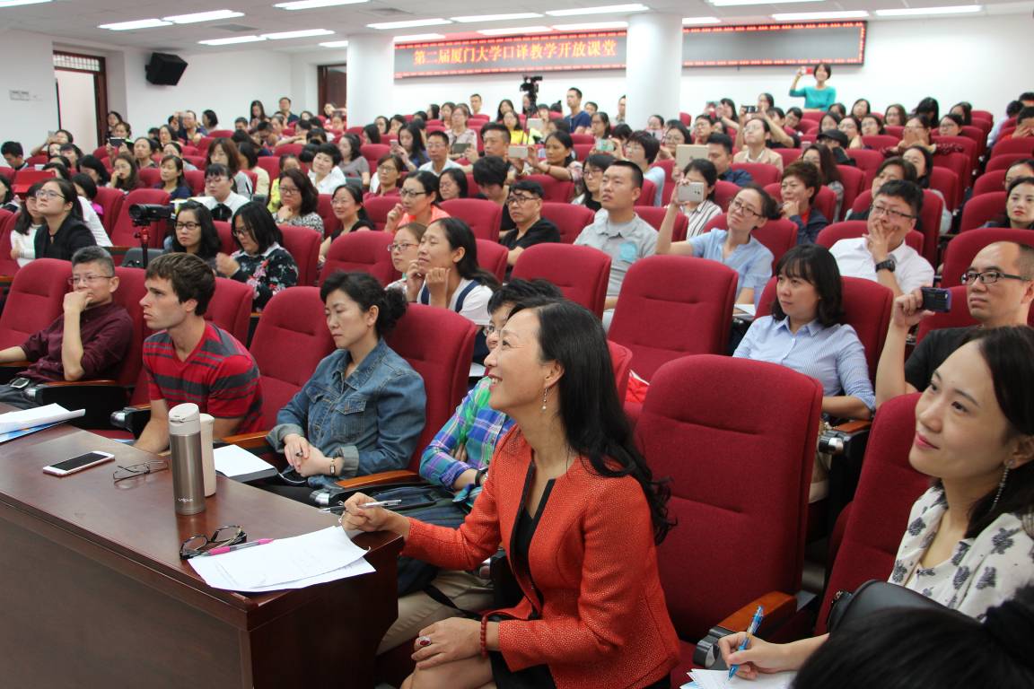 11月11日上午,由厦门大学口译研究所和上海外语教育出版社精心打造的第二届厦门大学口译开放课堂进入第二天的模拟口译会议教学展示环节。来自全国各高校近170位口译教师齐聚外文报告厅,欣赏了一场别开生面的模拟会议口译教学,并对外文口译学生的精彩表现以及他们和手语译员的完美配合点赞叫好!