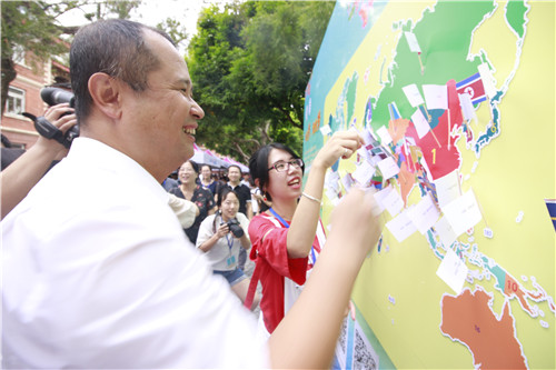 为了给2017级新生的入学第一天留下美好回忆,学院延续往年传统,为新生准备了独具特色的迎新活动。在印着完整世界地图的“中国梦,我的梦”背景板前,新生们自己挑选一个国家的国旗,并按照该国的所在位置将国旗插在世界地图上并与之合影留念。一个上午过后,五颜六色的各国国旗已经密密麻麻地插满了大半张地图,吸引了众多好奇和艳羡的目光。