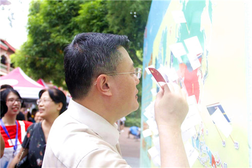 第一天上午10点左右,张荣校长、林东伟副书记来我院迎新点了解迎新进展,对前来报到的同学们表示慰问,询问了新生的基本情况,并与在场的外文师生亲切交流。在我院师生的盛情邀请下,张荣校长和林东伟副书记还亲自参与了“中国梦,我的梦”活动,在世界地图上插上了中国国旗。张荣校长表示,“世界眼光”和“家国情怀”对外文学院的学生意义深远重大,希望所有外文师生都能将此次参加厦门金砖会晤的服务奉献精神传承下去,在国际性舞台上发挥越来越重要的作用。