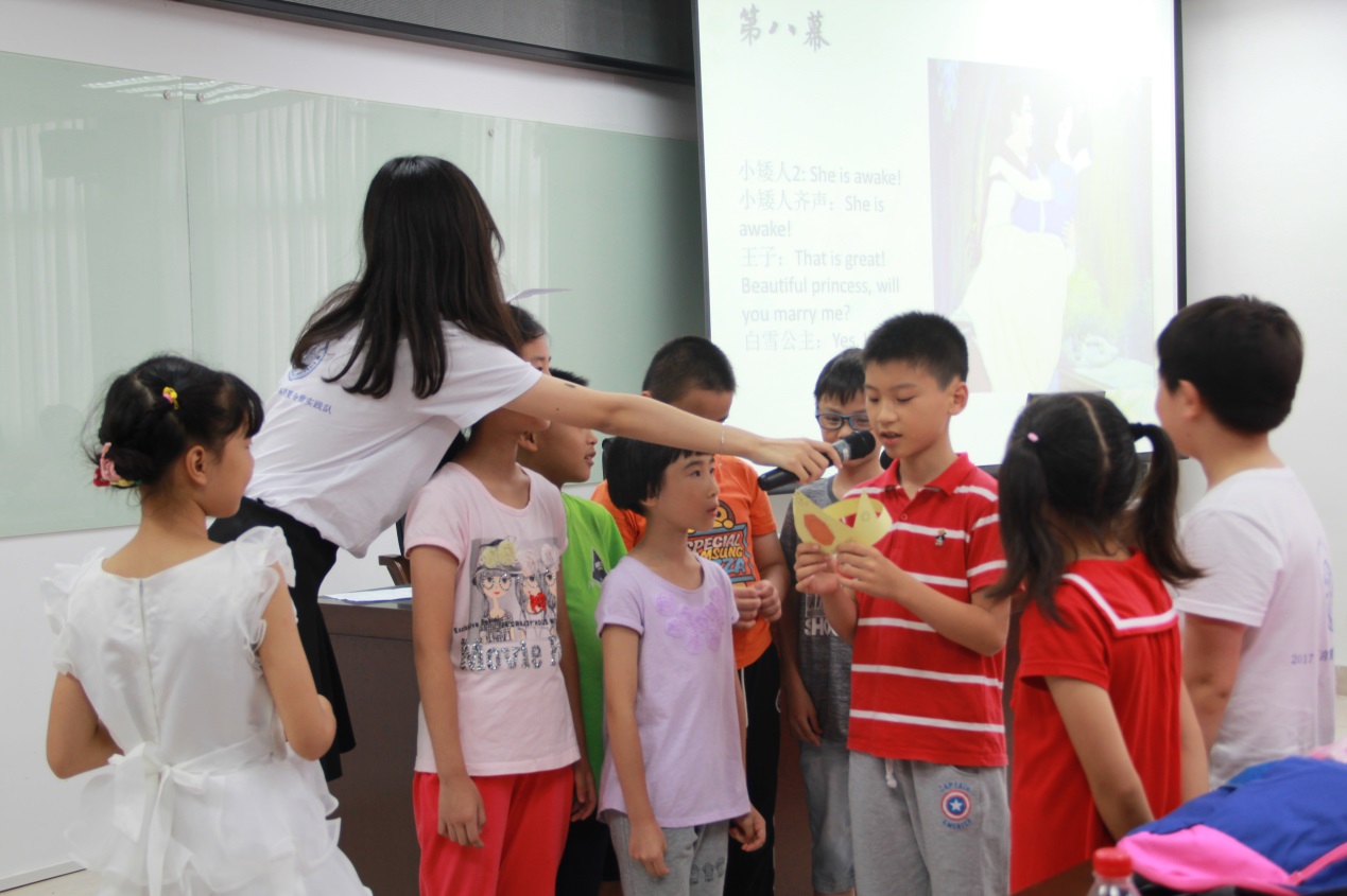 低年级一班的小营员们带来的是英语话剧《白雪公主》。小营员们把话剧中的纯真美丽的白雪公主、深情帅气的王子、古道热肠的七个小矮人、心肠歹毒的皇后、心地善良的猎人,乃至于抱诚守真的魔镜都演绎得唯妙唯肖,获得了如潮的掌声。
