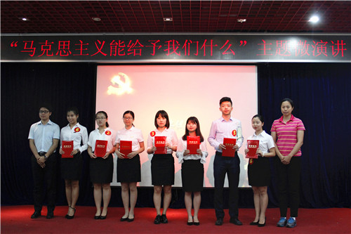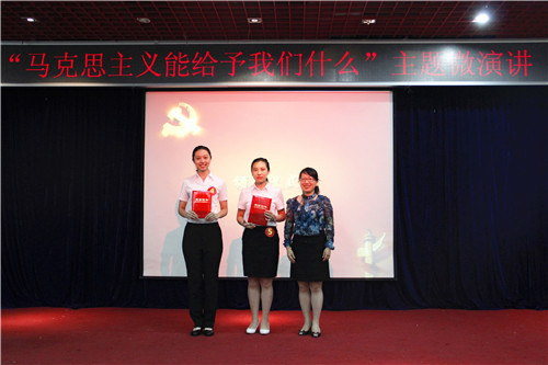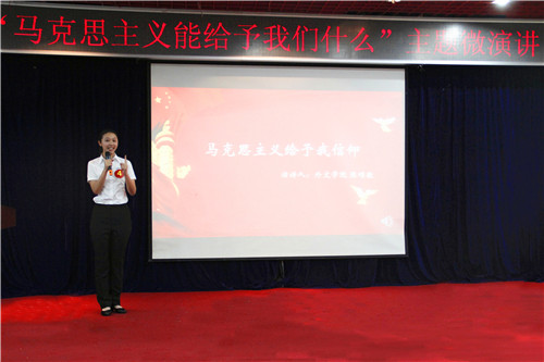 陈颂歌则以一名新发展的中共预备党员身份,在题为《马克思主义给予我信仰》的演讲中恳切地讲述了自己从递交入党申请书到通过党校成为预备党员的心路历程。她坦言,正是马克思主义信仰指引了自己前行的方向,激励自己将青春的激情挥洒在践行信仰的道路上。陈颂歌分享了自己在云南绥江支教、在“青丝行动”中捐献头发、参与“莫兰蒂”灾后重建等故事,她在演讲中铿锵有力地表示,自己将用一生的时间去诠释与捍卫马克思主义信仰