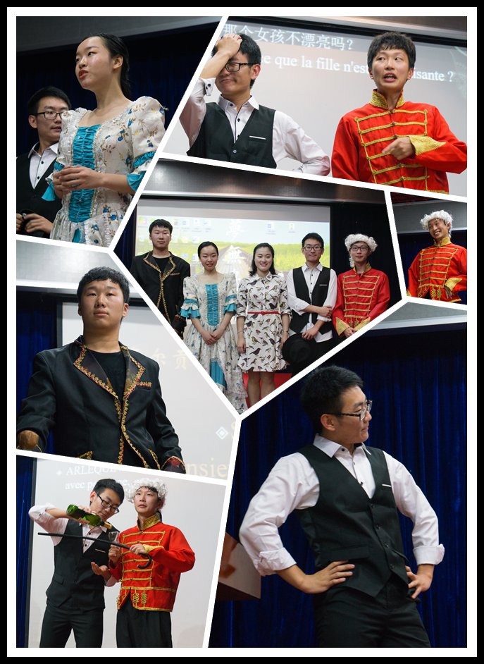 多样的法兰西文化远不止于一句话语、一曲香颂。在同学们的欢呼声中,帅气的外国友人Geoffrey MARCELLIN走上舞台,为同学们介绍les traditions de Pâques(复活节的传统习俗), 同时给在座的老师和同学们发放了与之相关食物巧克力蛋,现场氛围非常融洽。紧接着,来自本科三年级的Hélène(祖琳)、Daniel(唐国钦)、Évelyne(沈洁欣),二年级的Jonathan(陈元浚)以及一年级的Sébastien(王清鹤)五位同学共同表演了法国话剧《Jeux de l'amour et du hasard(爱情偶遇游戏)。他们身着法国传统服装,以流利动听的法语念白,不仅为观众呈现出一场视听盛宴,更是让在座的师生切身感受到法国人的生活片段、爱情观念。最后,来自本科二年级的Lydia(陈颂歌)以一曲极富感染力的香颂《Parler à mon père》(献给父亲的话)为晚会画下圆满句点。随后,主持人Guillaume LABOURDETTE宣布晚会圆满结束,同时邀请所有参与者上台合影,2017年美好的法语国际日晚会就此定格