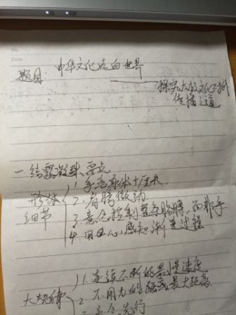 炎炎夏日,厦门大学外文学院“太极观真”暑期社会实践队不辞辛劳,开展了为期一周的太极文化寻根实践,成果颇丰。 8月8日下午,“太极观真”实践队一行三人先后到达北京,于北京市西火车站汇合,出发前往位于玉泉山脚下的“北京太极山庄文化研究会”进行太极文化的学习与体验。 在队长陈颂歌的带领下,一行队员先后参观了太极研究会的活动场所,并与太极山庄文化研究会主席康伟先生就太医文化传播的相关事宜进行了密切交谈。交谈中,康老师告诉大家太极文化的传播之路道阻且长,对于大多数学习者,存在着“知其然而不知其所以然”的问题。中国学习者尚且如此,准确生动地把太极文化对外传播开来更是难上加难。 在此后的五天时间中,研究会成员杨筠秀老师亲自教授了实践队员五式太极拳基本功――结露凝珠、日月回环、上善若水、寰宇流行、神合太极,队员们都全神贯注,跃跃欲试,不停地向老师提出关于太极拳招式与拳理的问题。 12日,完成了对太极拳基本招式学习,实践队一行又与研究会特别邀请到的具有丰富海外太极教学经验的“海盗”老师探讨中华太极文化在对外交流过程中存在的困难与问题,并共同探讨了解决之道。 14日上午,在进行了实践总结会并确定了以“中华文化走向世界――探究太极文化对外传播之道”为课题的大学生创新创业训练计划的下一阶段规划后,为了收集更多有助于课题研究的内容资料及实践经验,实践队全体成员在队长的带领下,前往北京月坛公园进行八卦掌学习访谈活动。太极与八卦掌文化同以道家文化为根,采访海外八卦掌练习者有助于挖掘西方文化中对于太极文化中“渐变规律”、“物极必反”规律的契合点。实践队员分工合作,编写访谈稿、录制访谈资料,总结访谈要点,收获颇丰。在访谈中,队员们发现不少练习者虽然练习八卦掌以及太极拳多年,对太极道家文化仍旧缺乏了解。这一结论给与实践队日后的研究工作不小的启发。 15日上午。北京风和日丽,一周的社会实践告一段落。队员整理行囊,各自归家,以更加积极的面貌投入学习和生活。 整个实践过程中,团队成员相互协作,主要工作包括制作问卷、统计分析数据、确定实践地点、联系活动地点、确定参观时间、监督财务管理、总结学习内容、拍摄活动照片等,队员们充分发挥了团结互助精神,出色地完成了任务。 此次的实践考察活动,在丰富了队员对太极文化内涵的了解的同时,也让大家对中外文化交流所面临的困境有了更加深刻的认识,对大学生创新创业训练计划课题“中华文化走向世界――探究太极文化对外传播之道”的进一步展开具有很大的启发。 此次实践是“太极观真”三名队员关于“中华文化走向世界――探究太极文化对外传播之道”课题研究的一次充电,实践的结束是下一阶段“大学生创业创新训练计划”工作的开始。太极观真,再接再厉!  队员学习“太极五式”基本功的笔记