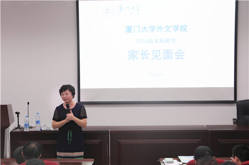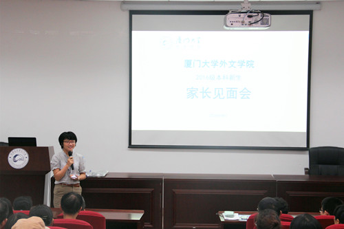 8月25日下午五点半,外文学院2016级本科新生家长见面会在南光三112教室准时举行,外文学院党委副书记杨云良老师与副院长徐琪老师共同出席。此次大会的主要目的是让家长们了解我院的基本情况、清楚子女在大学四年里即将遇到的机遇和挑战,同时解答家长对新生未来学习与生活的疑惑。本次家长会由2016级本科生辅导员肖盈老师主持。 徐琪老师首先上台讲话。她首先对到场的家长们表示感谢与祝贺,接着对外文学院的概况作了介绍;其中,她重点介绍了外文学院的学科水平及本科生升学和就业情况,并着重对今年新开设的西班牙语专业进行了讲解。她表示,西班牙语专业虽在今年新开设,但具有雄厚师资,请各位家长放心。徐琪老师同时指出,希望家长与老师们一起,共同帮助新生们迎接挑战、尽早适应大学校园生活。 接着,杨云良老师也对学院的基本情况作了简明扼要的介绍,并表示学院一定做好家长与学院的联络工作,尽力为家长答疑解惑。 接下来,辅导员肖盈老师为家长们指出了在接下来的四年里,家长们可以与孩子一起做的三点努力:第一,在新生适应阶段如何帮孩子们调整心态,适应大学生活;第二,如何与孩子一起规划大学生活,实现目标;第三,如何在漫漫长路上与孩子们一同面对挫折,迎接挑战。 肖盈老师强调,由于生活与人际环境的变化,孩子们多多少少会产生一些压力,这时候就需要家长们给予鼓励,一起面对。她提出,新生们在大学生活中将会面对几个选择,一是双学位,二是出国,三是学生工作。三个选择各有利弊,然而首先要保证的,一定是个人在专业上的成绩,学有余力,然后再做选择。最后,选择之上,应该有一个总的目标。无论是未来是要读研还是工作,都要尽早做好准备。 之后,家长见面会进入答疑环节。家长们踊跃提问,问题涉及到学生们的户口迁移问题以及在大学的学习、学生工作与生活等多个方面。杨云良老师、徐琪老师和肖盈老师认真回答了每一个问题,不时出现的幽默“金句”更将全场气氛推向高潮。 通过这次家长会,家长们对子女未来四年的大学学习生活有了更深刻的了解,老师们和学生家长们之间的距离也拉近了许多,为今后建立良好的家校联络体系打下了坚实的基础。相信有了老师和家长的鼓励与支持,2016级本科新生们的大学生活将更加顺利、更加丰富多彩。  院党委副书记杨云良老师在见面会上讲话