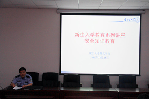 11月25日晚7时,外文学院2015年新生入学教育系列讲座之安全知识教育讲座在南光三112会议室举行。讲座由厦门市公安局思明分局大学路派出所季智均警官、厦门大学保卫处陈锦华副处长主讲,外文学院2015级本科生辅导员杨盛澜以及外文学院全体15级新生参加了此次讲座。