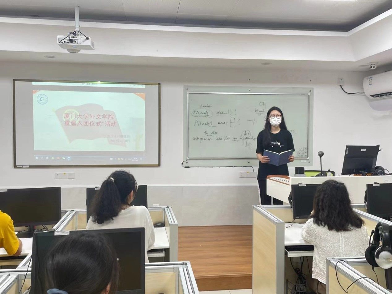 在五四青年节即将到来之际,习近平总书记走进中国人民大学,深情寄语广大青年,为深入学习习近平总书记在中国人民大学考察时的重要讲话精神,深化党的百年奋斗重大成就和历史经验的学习,勉励全体团员立志做合格的、优秀的共青团员,厦门大学外文学院团委于5月9日,利用双周政治理论学习时间组织本研全体学生以团支部为单位开展了“学习习近平总书记在中国人民大学考察时的重要讲话精神”政治理论学习和重温入团仪式活动。