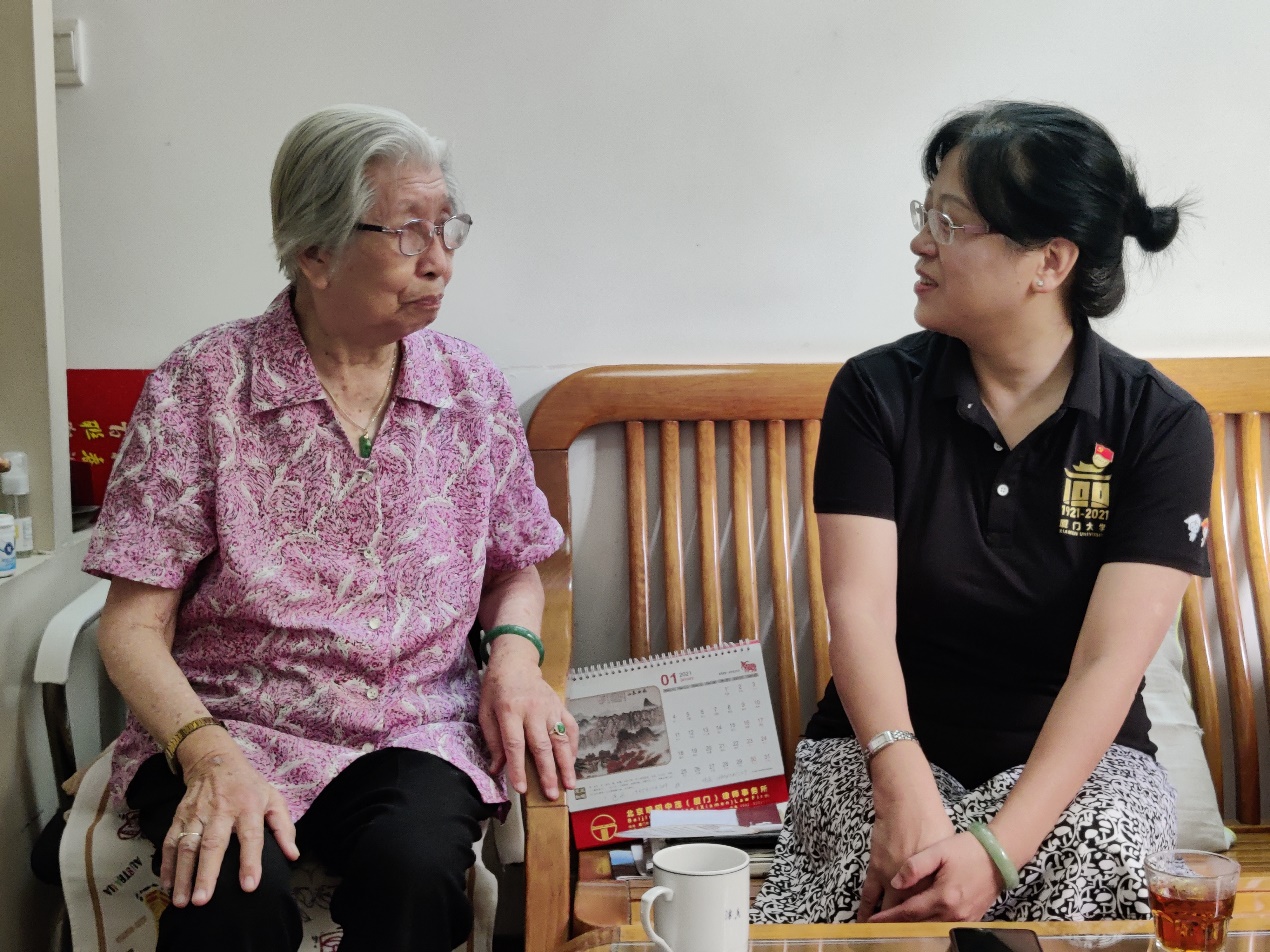 在两位老同志家中,陈志伟与两位老党员促膝交谈,关切询问日常生活和身体健康状况,邀请两位老同志讲述他们个人的革命历史,共同回顾我们党的百年光辉历程。曾淑萍回顾了在菲律宾期间的革命经历以及回国后参加社会主义建设的光荣历史。曾老师自小学时就通过身边的进步人士、文学作品接触到马克思主义思想。1942年,年仅14岁的她即投身革命,1944年正式加入菲律宾共产党。曾老师在菲积极投身抗日爱国一线工作和抗战胜利后党的地下活动。1958年回国后,积极参与党的侨务、高等教育等工作,为厦门大学、华侨大学英语专业建设作出了卓越贡献。连淑能着重介绍了驻外期间和建院期间的历史。连老师1966年入党,在我校毕业后留校任教,七十年代外派圭亚那驻外,八十年代着手人工语言与机器翻译的前沿科研项目,面对IBM公司和纽约州立大学的诱人邀请,他毅然选择回国并继续完成由其承担的国家863计划机器翻译研究并取得了优秀成果。九十年代,他应邀赴英国牛津大学及剑桥大学作高级访问学者,形成长篇考察报告《牛津剑桥之谜》上报教育部,应邀到全国各大高校做了200多场报告。1999年,我校进行校内管理体制改革,组建外文学院,连老师担任首任院长。