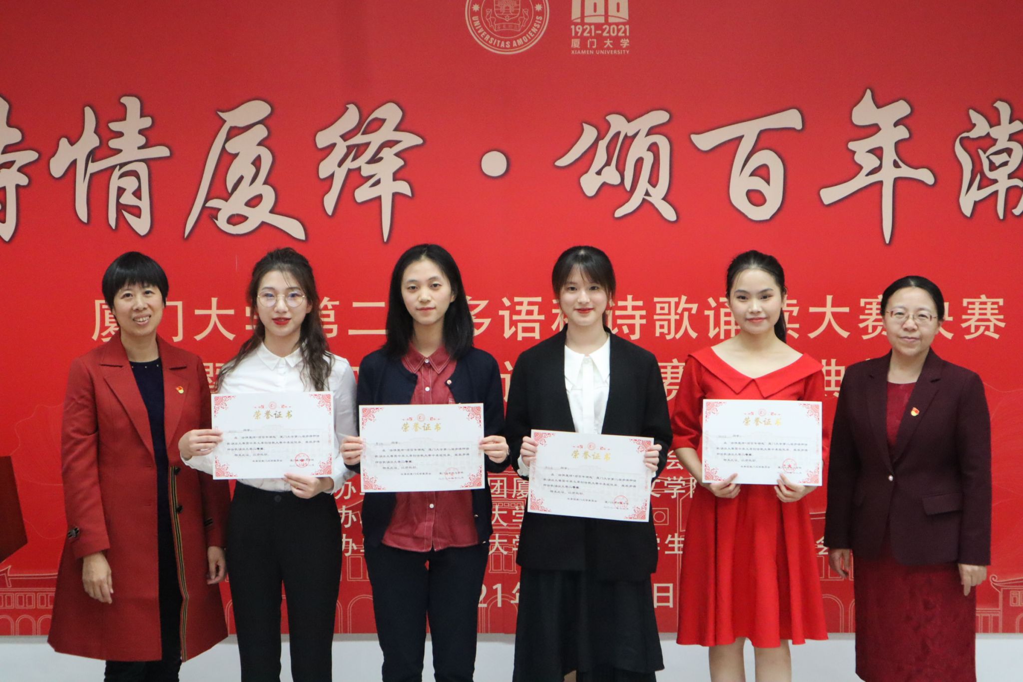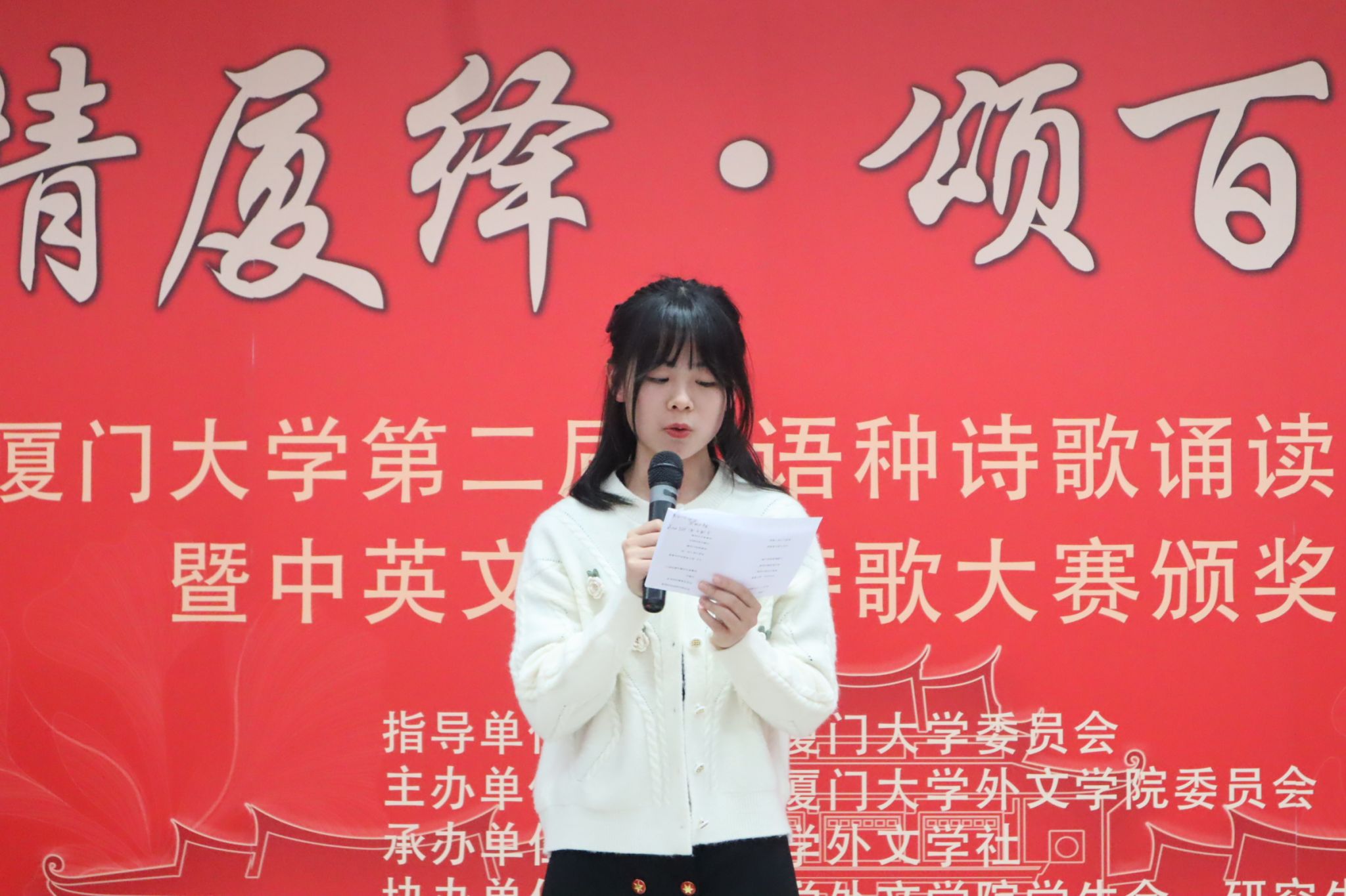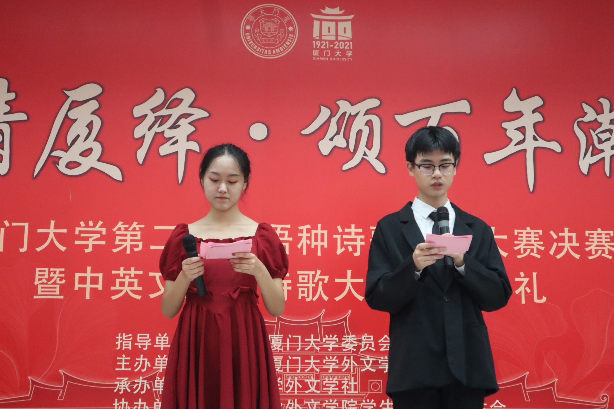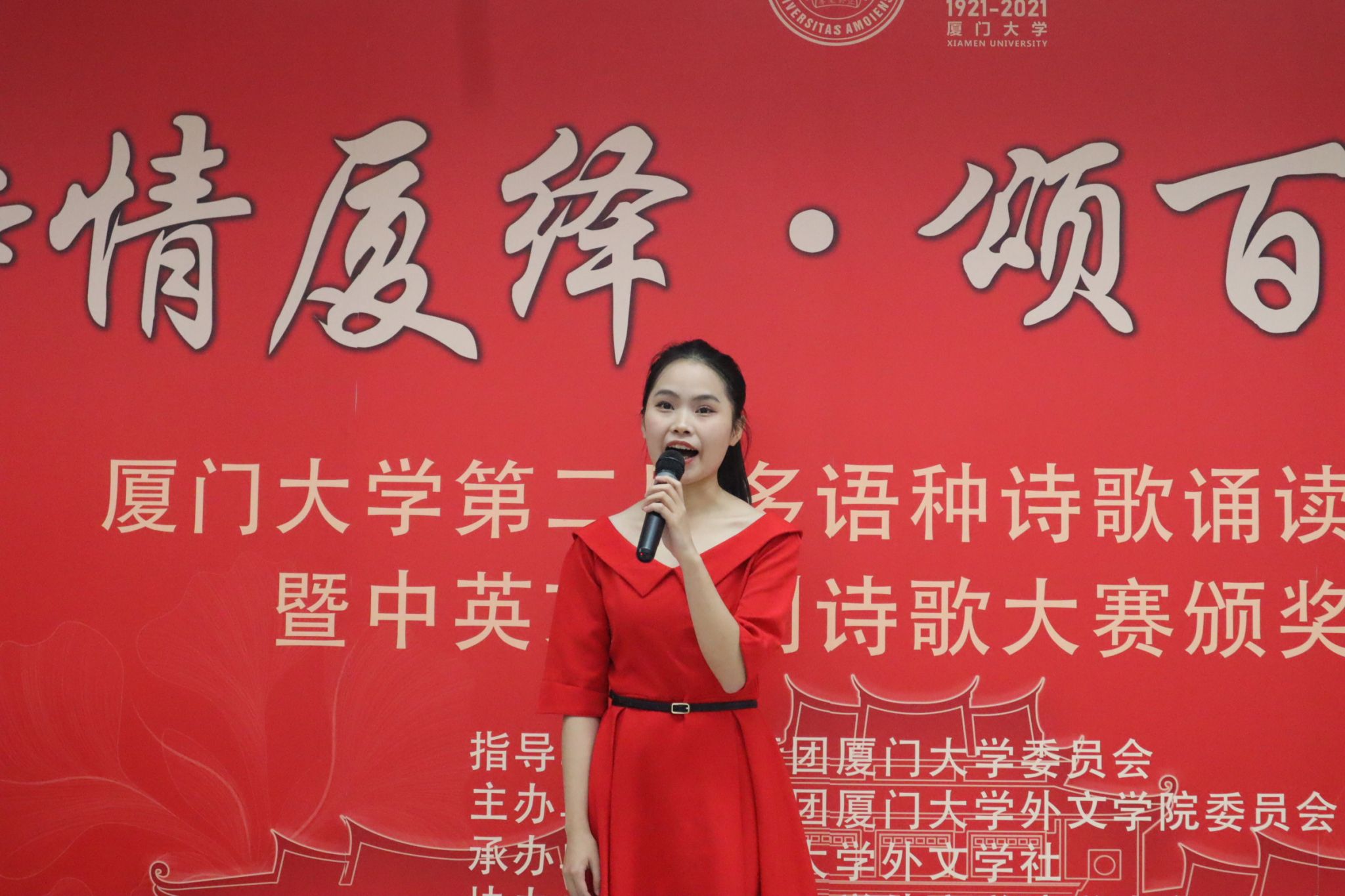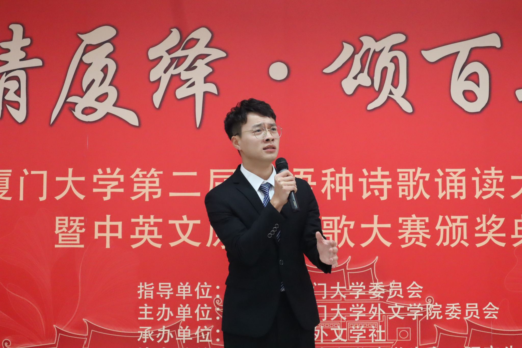 至此,厦门大学“诗情厦绎·颂百年潮起”第二届多语种诗歌诵读大赛暨中英原创诗歌大赛颁奖典礼圆满落幕。此次比赛以建党百年为契机,以多语种诗歌诵读和中英文诗歌创作为载体,鼓励同学们一展诗情,抒发爱党爱国情怀,更为同学们提供了感受诗歌文化、交流碰撞思想的平台。在近半个月的时间里,比赛通过一首又一首的经典诗篇,带全校师生领略了一场诗歌盛宴,更展现了厦大学子积极向上的精神风貌。未来,外文学院将持续推进校园文化建设,引导广大学子感受语言艺术的魅力,绽放青春年华的光彩,为营造校园文化氛围、促进学生综合发展添砖加瓦。