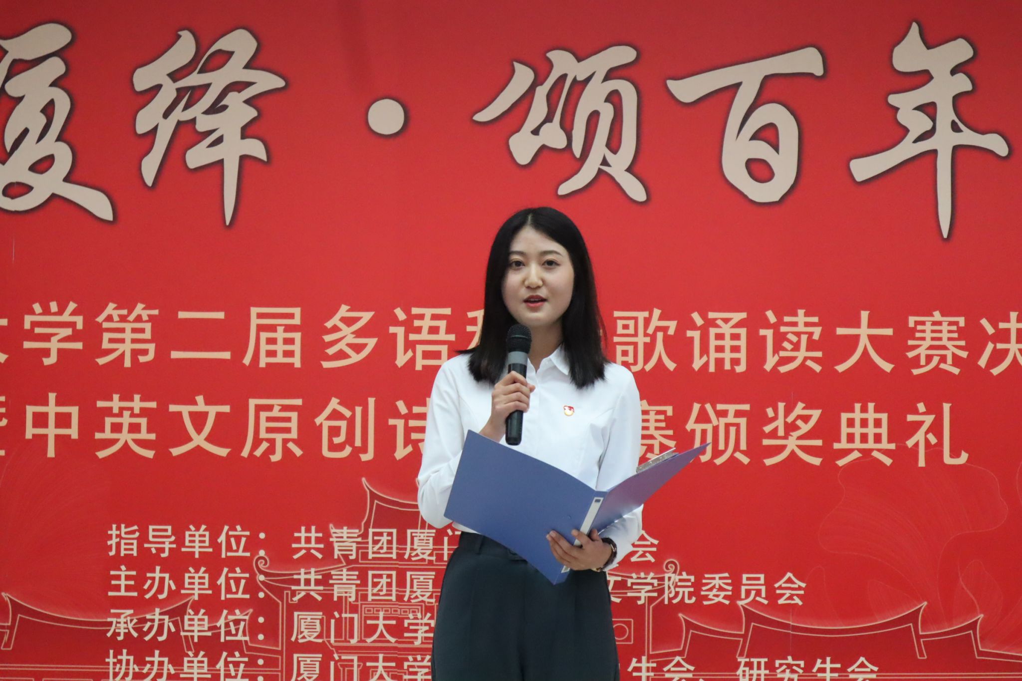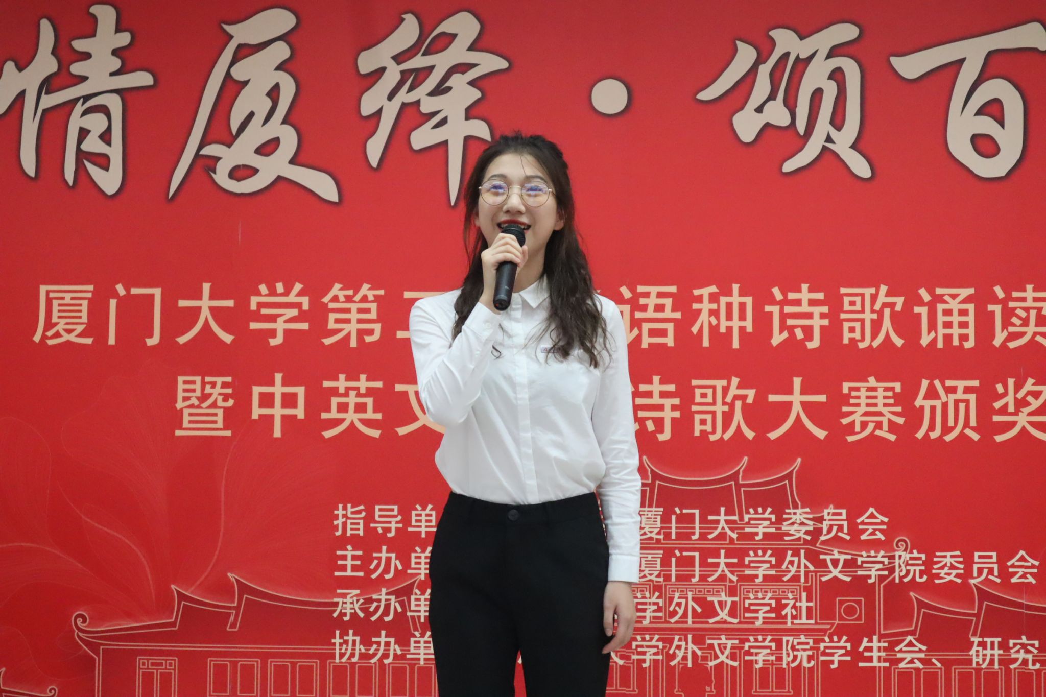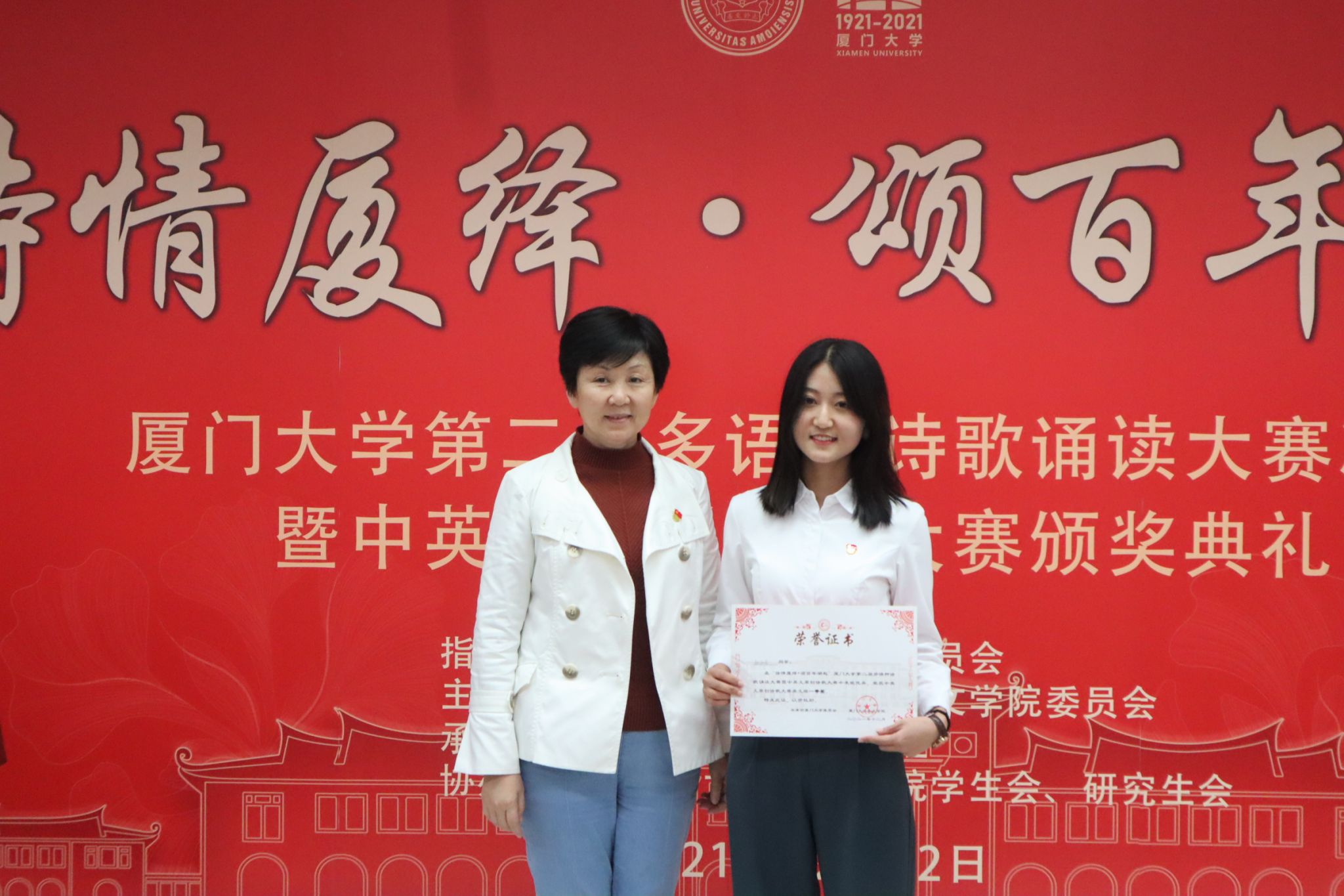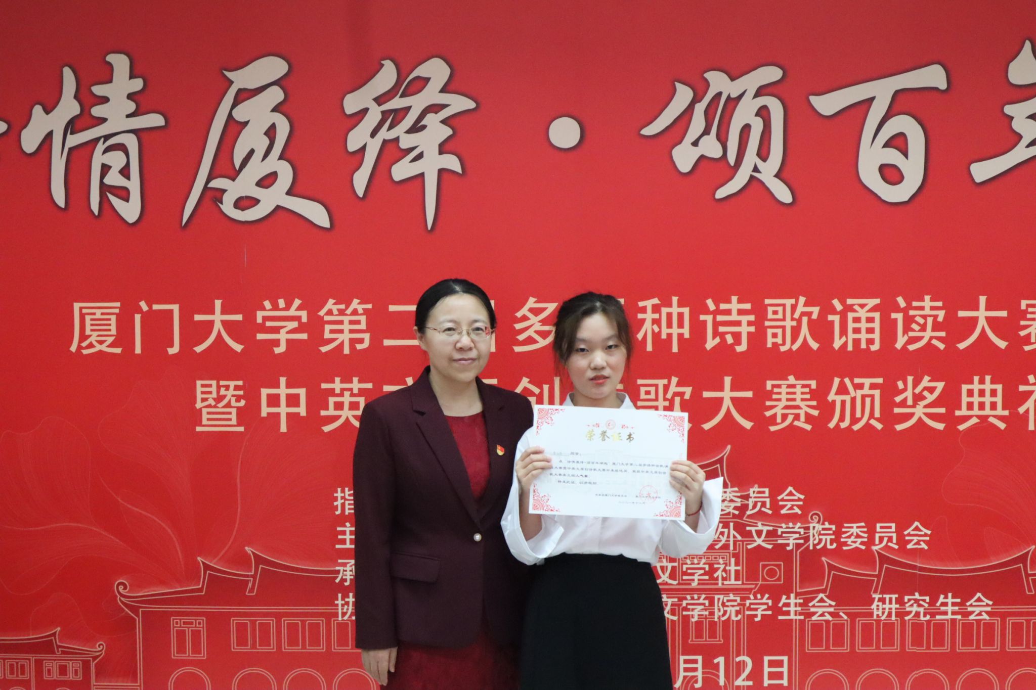 至此,厦门大学“诗情厦绎·颂百年潮起”第二届多语种诗歌诵读大赛暨中英原创诗歌大赛颁奖典礼圆满落幕。此次比赛以建党百年为契机,以多语种诗歌诵读和中英文诗歌创作为载体,鼓励同学们一展诗情,抒发爱党爱国情怀,更为同学们提供了感受诗歌文化、交流碰撞思想的平台。在近半个月的时间里,比赛通过一首又一首的经典诗篇,带全校师生领略了一场诗歌盛宴,更展现了厦大学子积极向上的精神风貌。未来,外文学院将持续推进校园文化建设,引导广大学子感受语言艺术的魅力,绽放青春年华的光彩,为营造校园文化氛围、促进学生综合发展添砖加瓦。