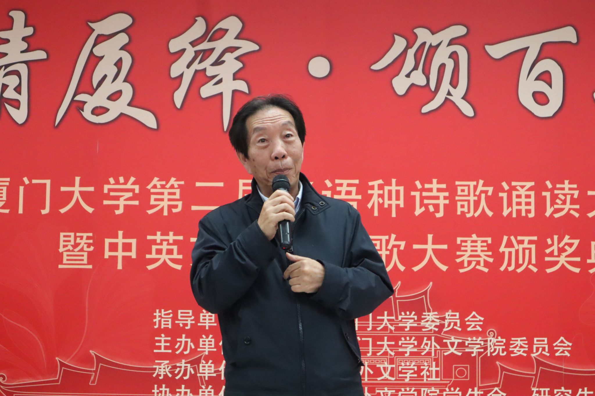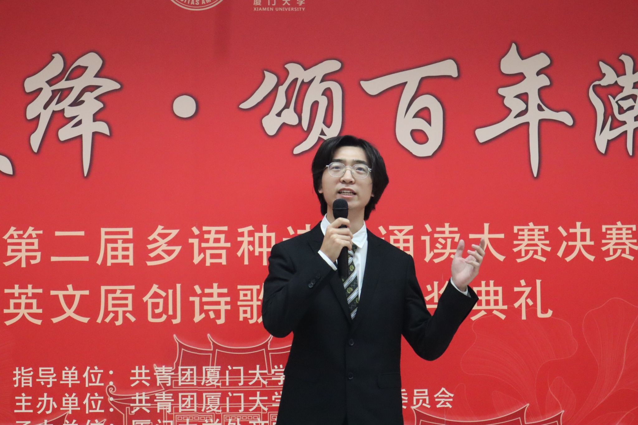 12月12日晚,“诗情厦绎·颂百年潮起”厦门大学第二届多语种诗歌诵读大赛决赛暨中英文原创诗歌大赛颁奖典礼在德贞楼112报告厅举办。厦门大学美育与通识教育中心副主任、教务处副处长楼红英,厦门大学人文学院教授、原人文学院副院长朱水涌,外文学院关心下一代工作委员会常务副主任、日语系教授陈端端,欧语系俄语专业副教授陈升法,英语系助理教授肖兴政,欧语系德语专业助理教授毛学勤,欧语系西班牙语专业助理教授梁琳,法语系助理教授黄荍笛担任评委。外文学院党委副书记沈丽秀、副院长辛志英、团委副书记戴晓燕莅临现场,与同学们共同品味诗歌的韵律与魅力。