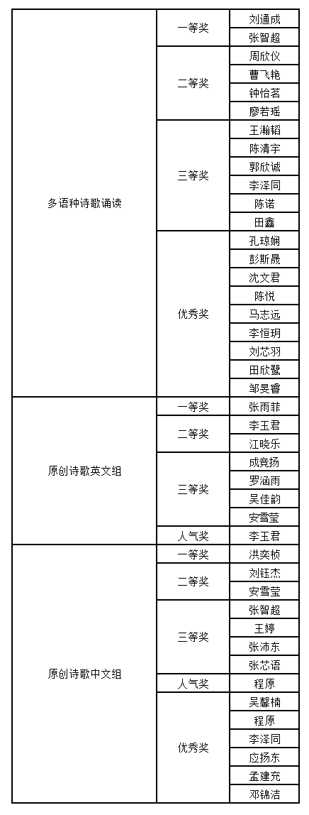 最终,来自法学院的刘通成同学和来自人文学院的张智超同学获得一等奖,来自外文学院、化学化工学院、生命科学学院、公共事务学院、新闻传播学院的多名同学分获二、三等奖以及优秀奖。同时,现场嘉宾们还为中英原创诗歌大赛的获奖选手进行了颁奖。