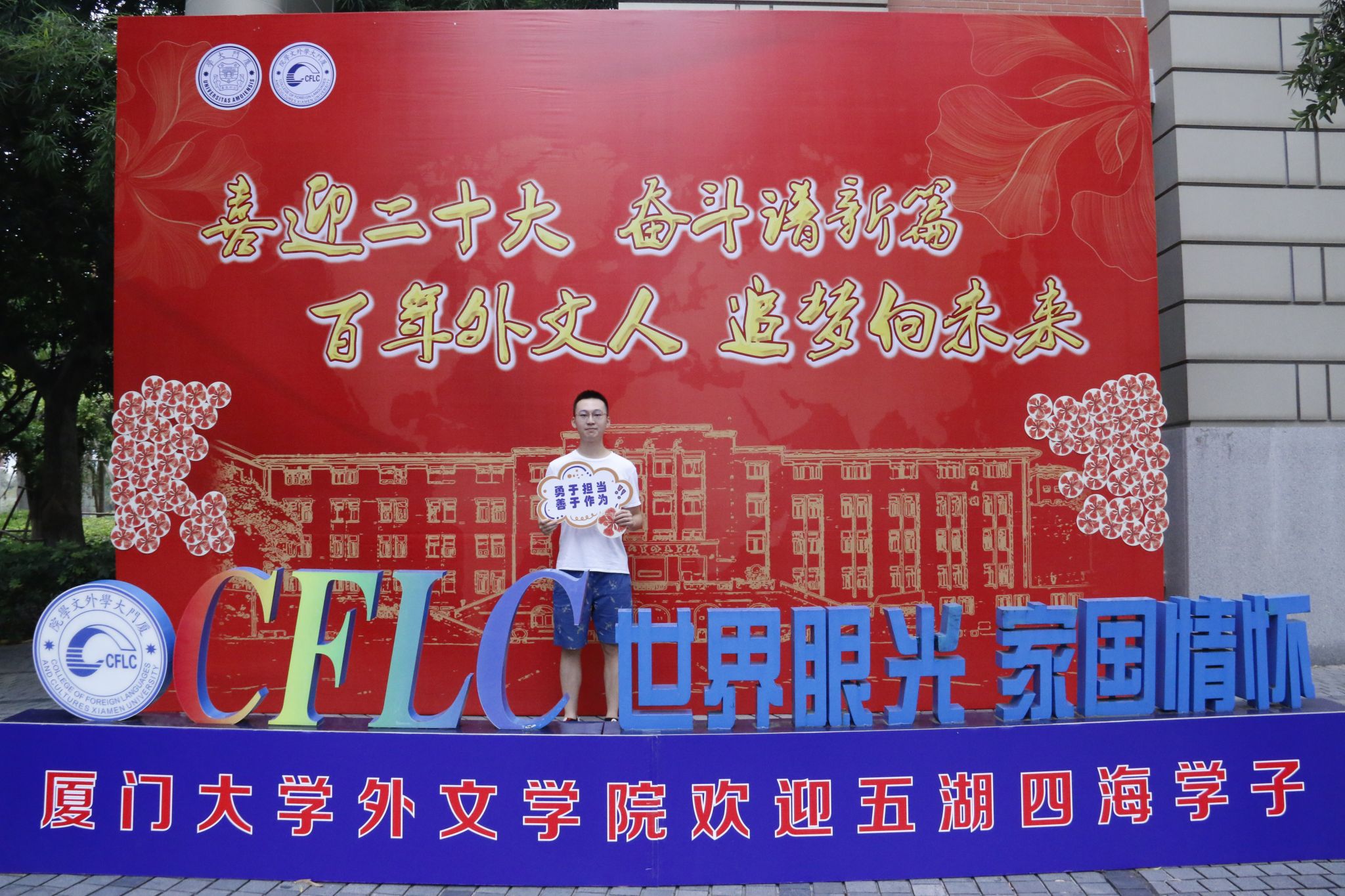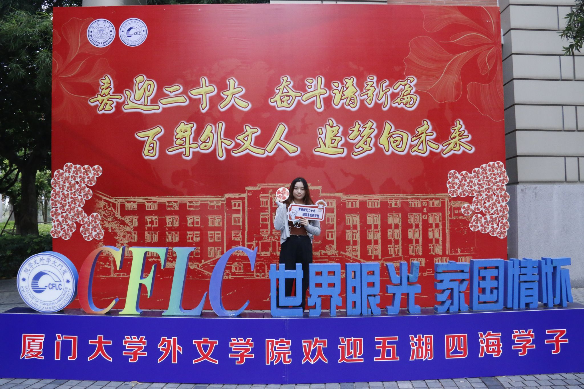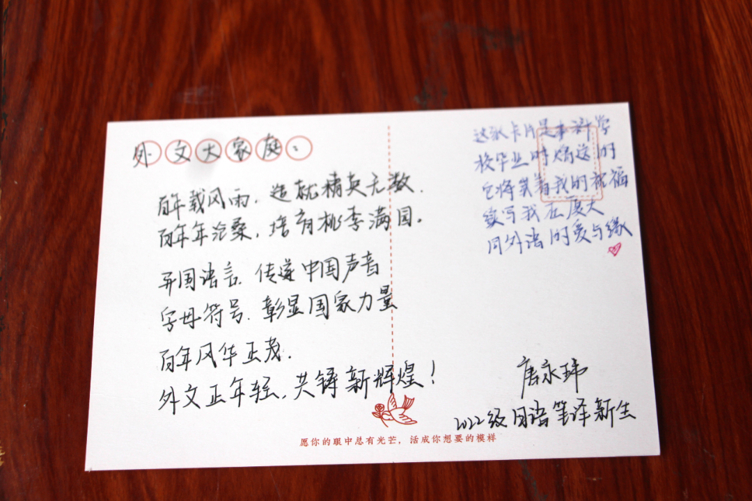 明年是厦门大学外文学科成立100周年,怀着对学院的祝福和对自己未来学习生活的期待,同学们选取了有家乡特色或有特殊意义的明信片,写下对百年外文的祝福和对未来的憧憬,将明信片投入学院迎新点的祝福邮筒,同时携带老师和学长学姐的美好祝福,拍下初入厦园的第一张照片,留下美好的回忆。