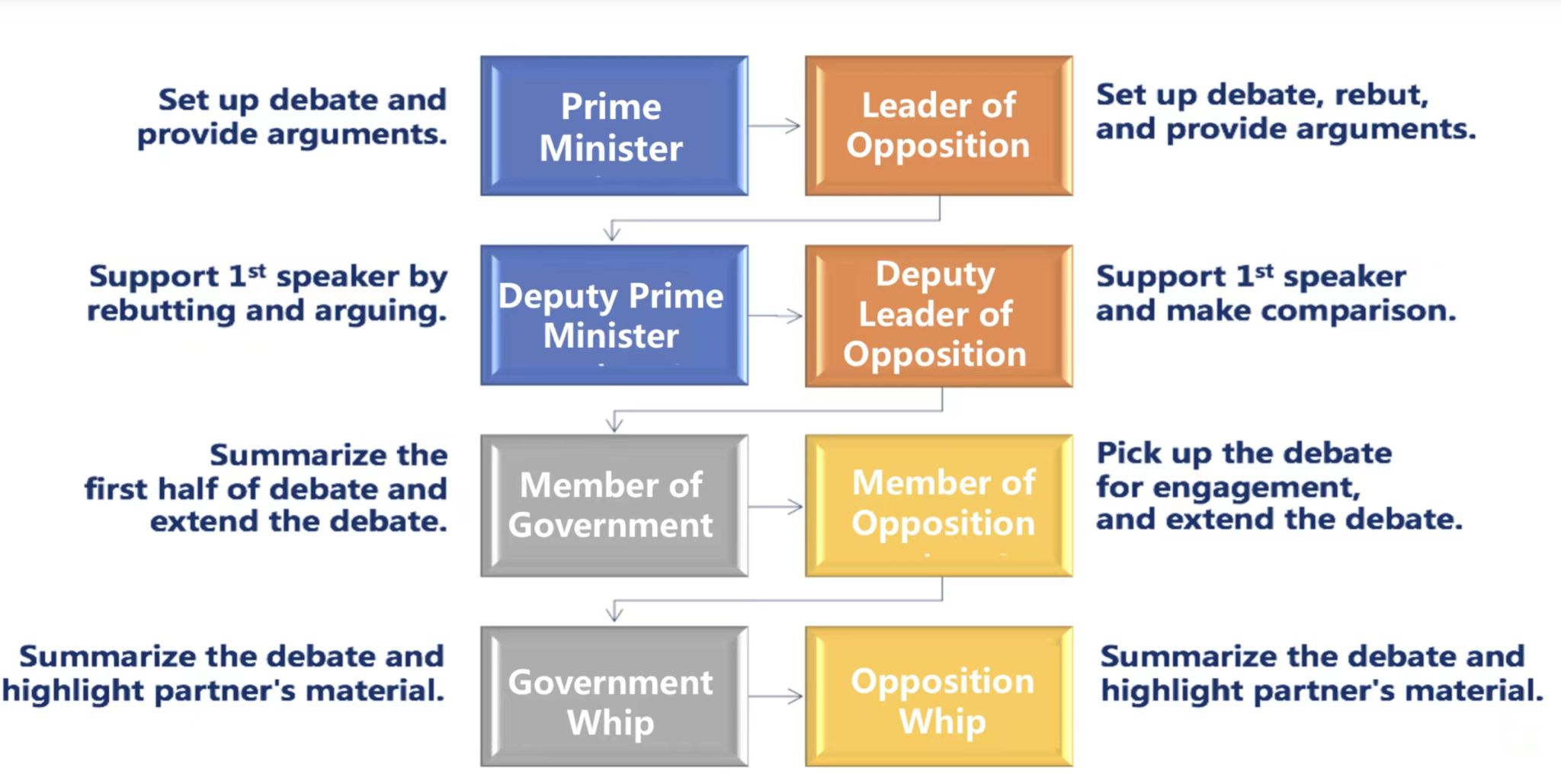 外研社英语辩论比赛采取英国议会赛制(British Parliamentary Debate),BP赛制的要点如下: