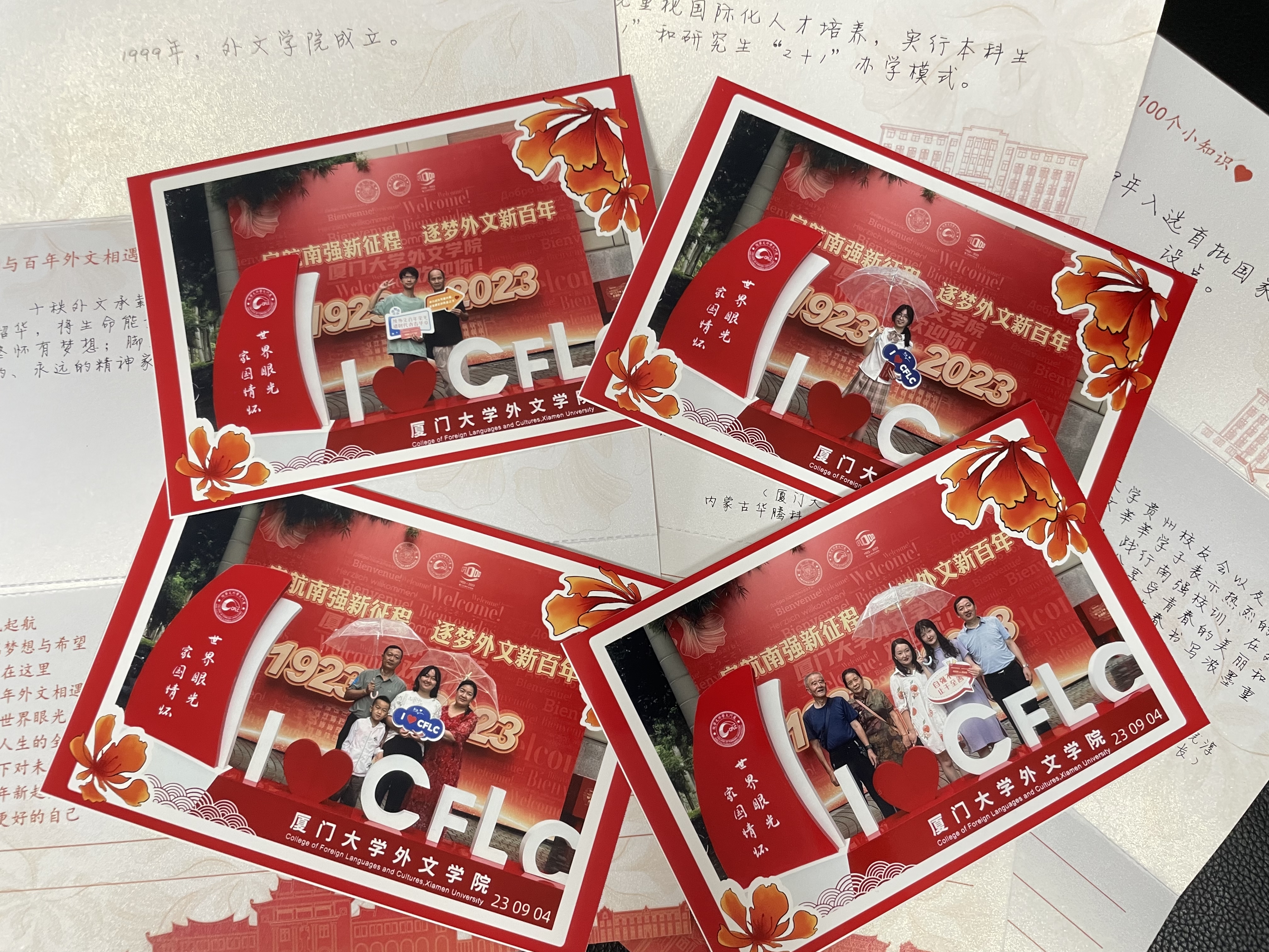 今年是厦门大学外文学科创建100周年,外文学院以“启航南强新征程 逐梦外文新百年”为主题,赓续百年传承,邀请全球各地的外文院友写下对新生们的寄语。来自不同年代、不同专业的外文院友与新生隔空对话,字里行间流露出对学弟学妹的真诚祝福和满心期许,将外文人独有的浓浓情谊薪火相传。在寄语卡片的另一联,学院还特别印上“关于百年外文的100个小知识”,从小切口折射百年筚路蓝缕,与新生们共同回顾往昔峥嵘路,展望未来新宏图。