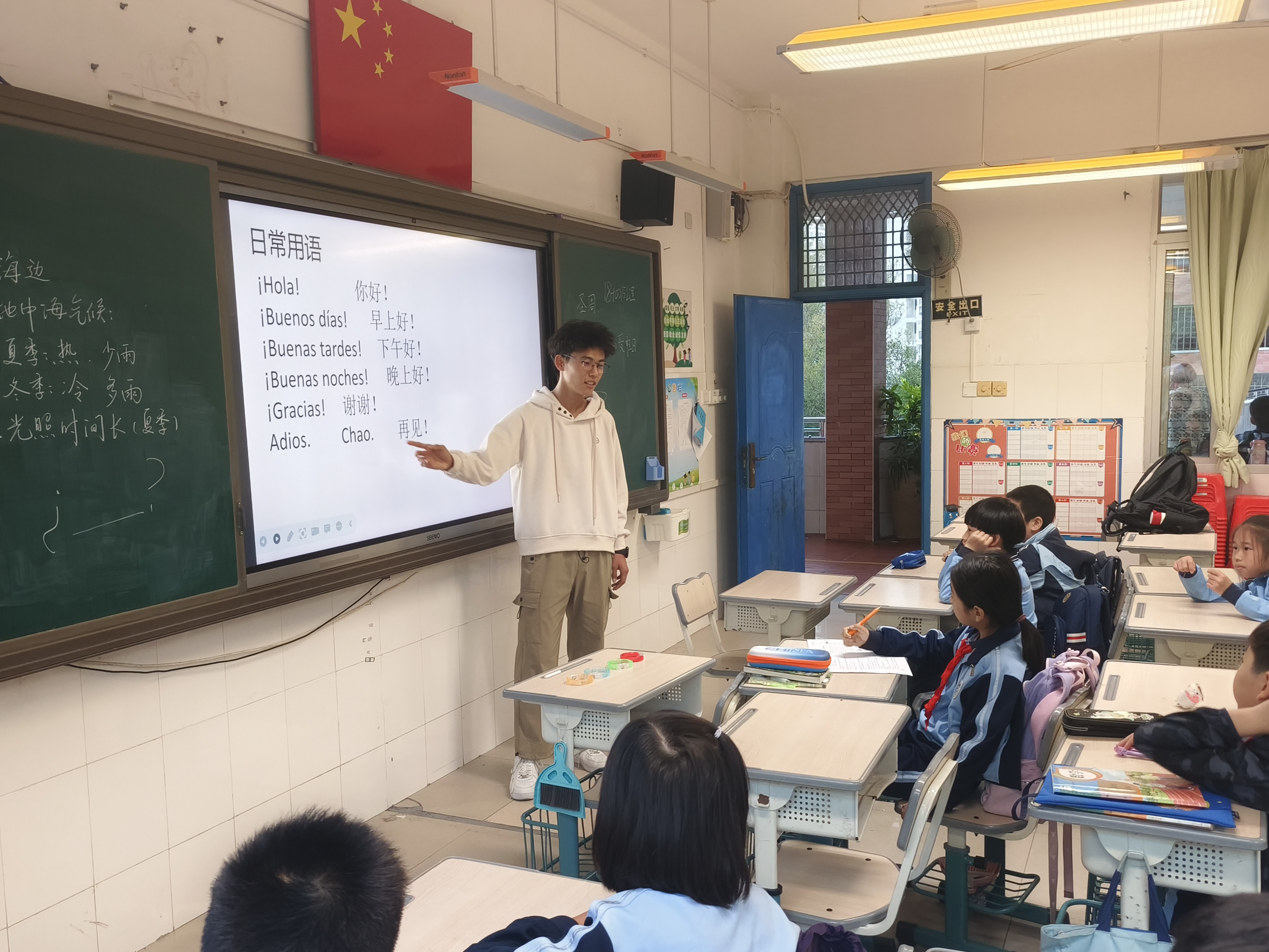 西班牙语专题,2023级西班牙语专业本科生刘凌岩带小朋友们领略西班牙特色弗拉门戈舞蹈,了解西班牙的美食、气候与风景,为小朋友们介绍西班牙语一大特色——弹舌,并教授了“你好”“早上好”“再见”等日常用语的西班牙语表达。