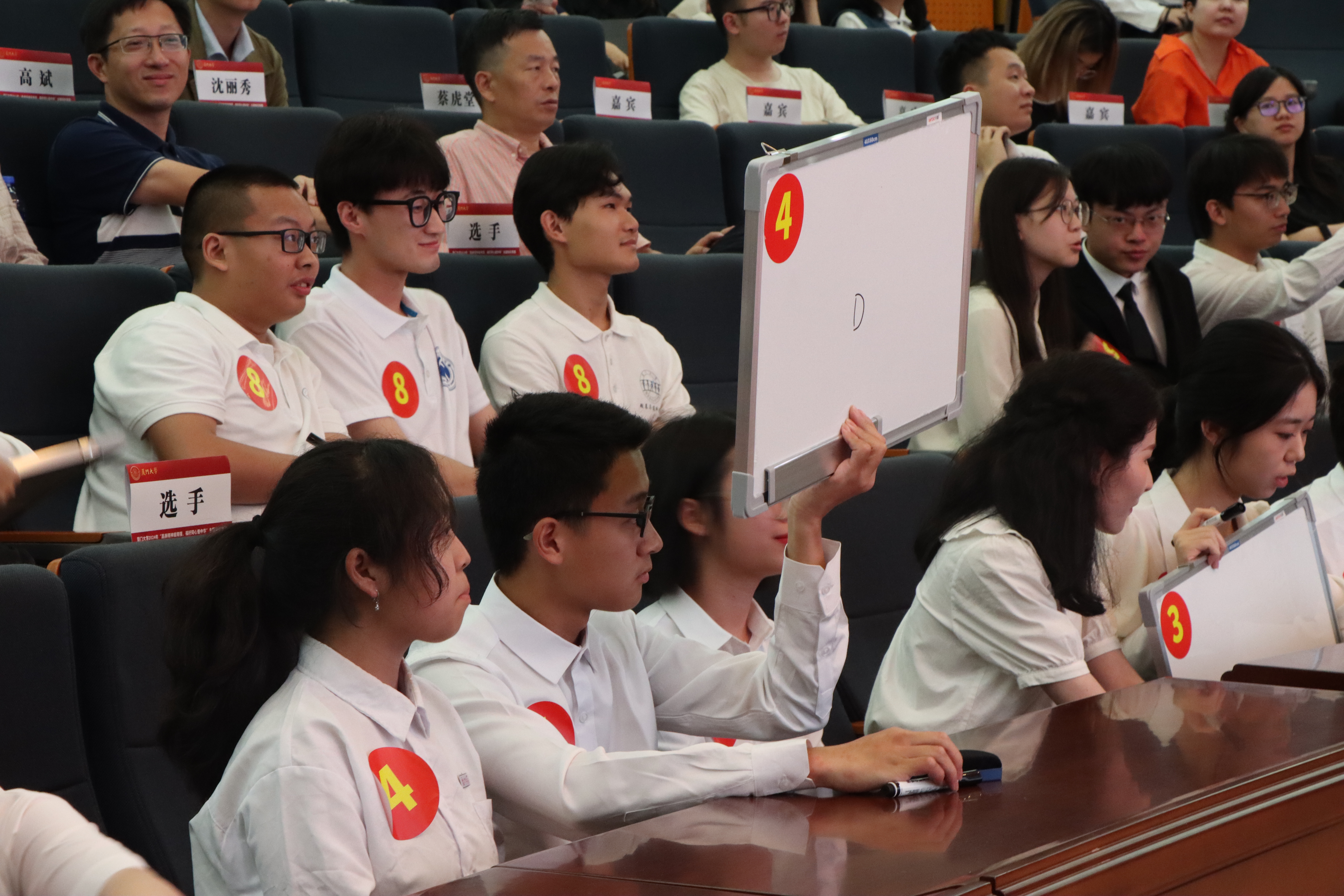 第二环节是“眼疾手快”抢答题。晋级的6支队伍按照抽签结果两两分组,最终抢答得分排名前三的队伍进入第三环节。“云开月明三江源”队伍与来自社会与人类学院的1号队伍进行对决,我院三位同学凭借丰厚的知识储备、良好的记忆力、专注力与现场应变能力积极抢答,现场战况一度十分激烈。虽然“云开月明三江源”队没能战胜对手,但外文学子拼搏进取的精神风貌依旧给现场观众留下了深刻印象。