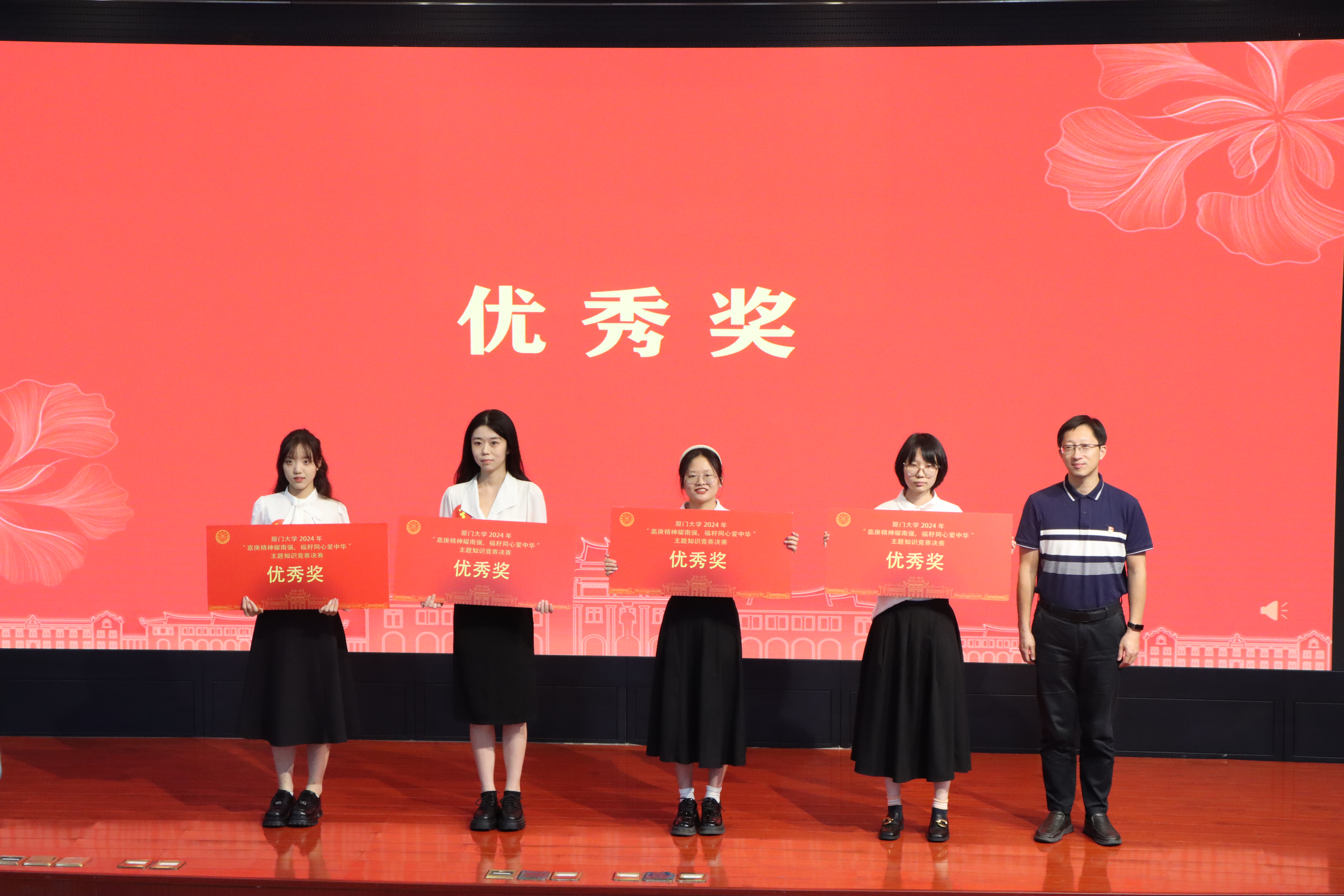 5月12日,厦门大学“嘉庚精神耀南强,福籽同心爱中华”主题知识竞赛决赛在经济楼N402报告厅举办,厦门大学学生工作部部长洪春生、副部长高斌,学院党委副书记沈丽秀,以及学校相关部处和学院领导出席活动。我院学子黄文豪、杨霞和居萨旺措组成的“云开月明三江源”队,熊秋婷、潘雨薇和李银晶组成的“多言一体”队经过初赛的激烈角逐,脱颖而出,在决赛现场以出色表现分别斩获三等奖和优秀奖,我院也凭借竞赛期间的积极动员和有序组织荣获“优秀组织奖”。