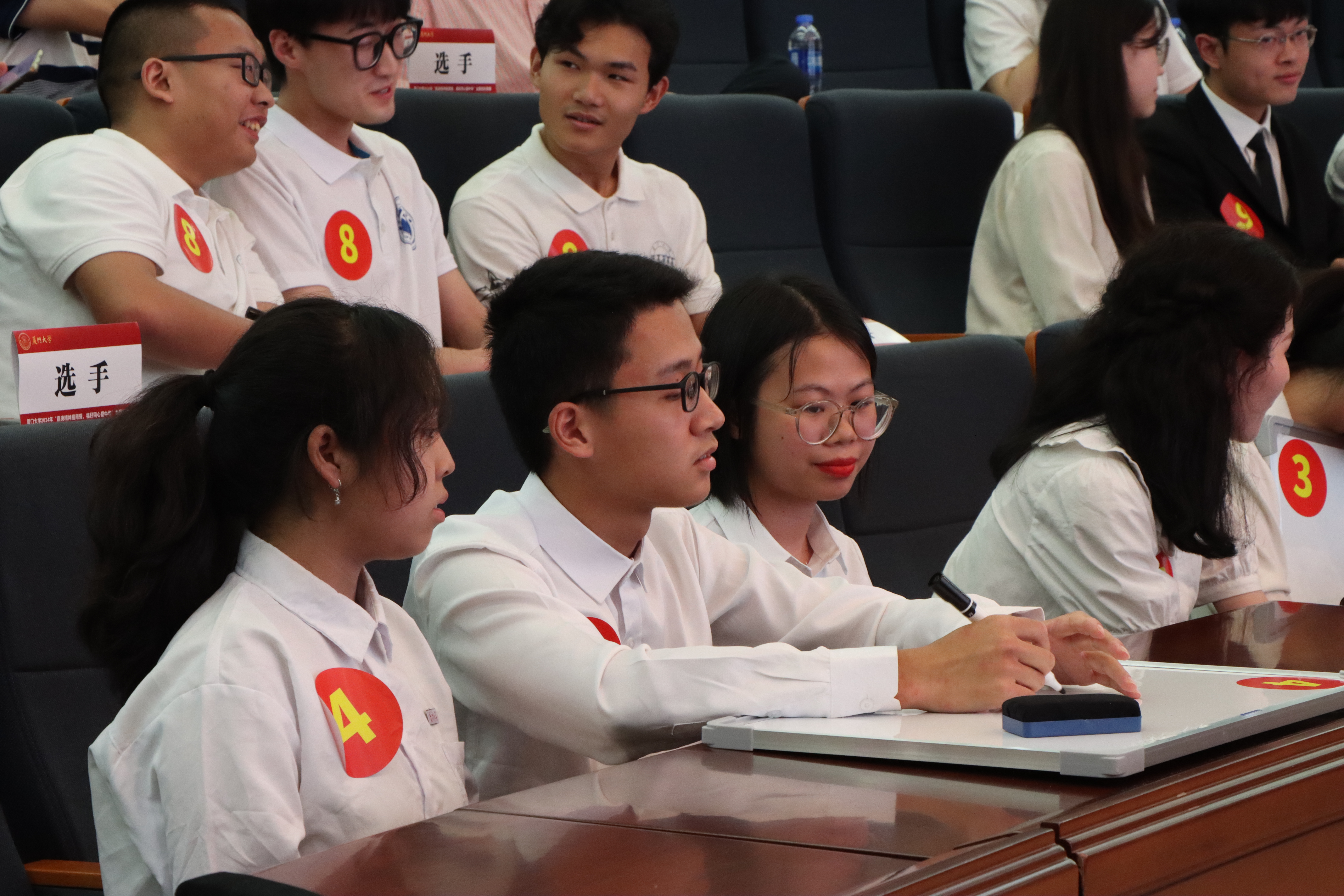 决赛现场气氛紧张而热烈,第一环节为“齐心协力”必答题,选手们需在规定时间内在答题板上写出答案,以该环节累计得分排名,得分前6名进入第二环节。我院两支队伍积极应战,“云开月明三江源”队积极讨论,配合默契,凭借优异的成绩直接晋级第二环节。“多言一体”队聚精会神,认真作答,在加时赛环节遗憾惜败,止步于第一环节。