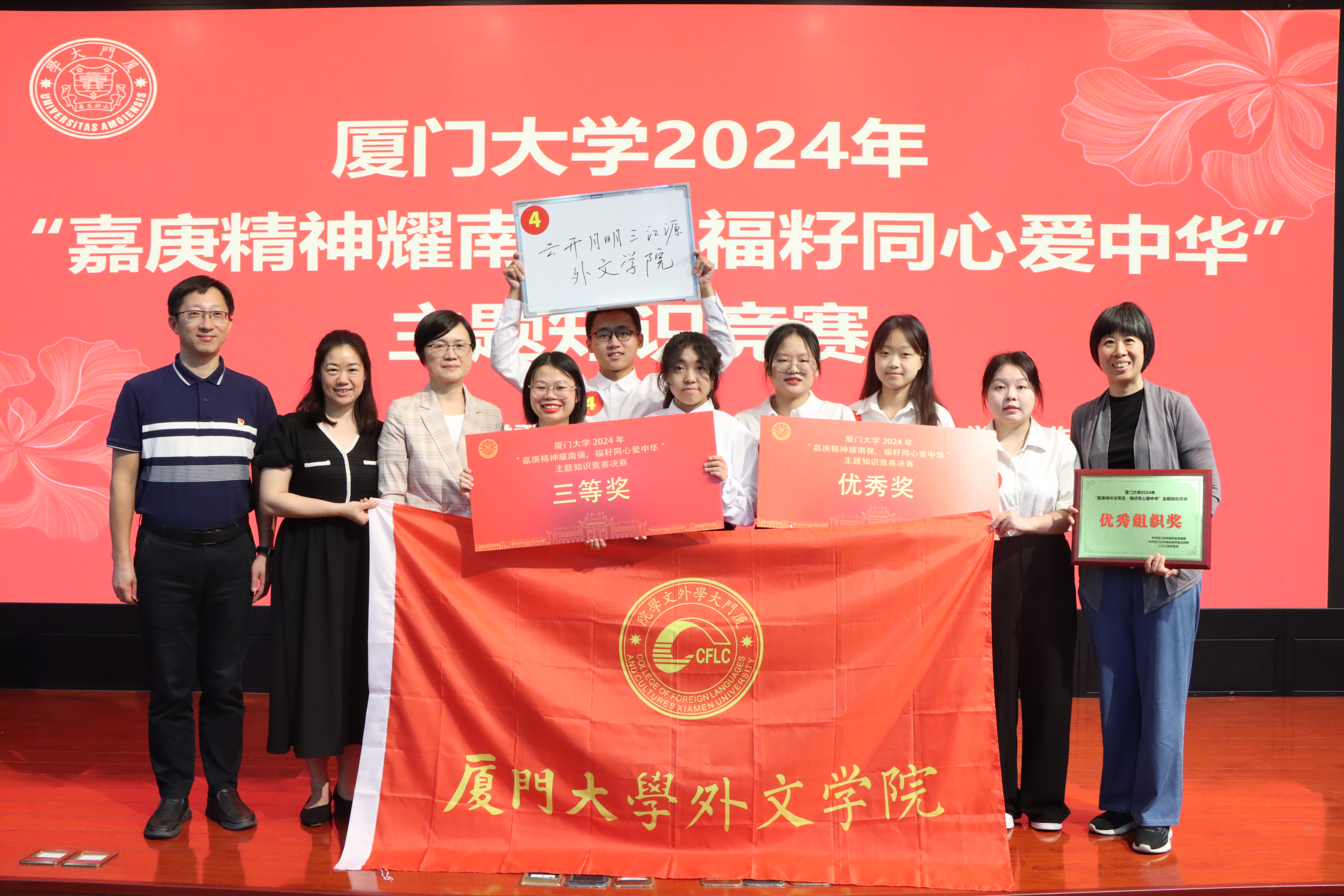 外文学院在本次竞赛中取得的优异成绩充分体现了外文学子扎实的知识储备和朝气蓬勃的青春风貌。未来,学院将继续深入推进嘉庚精神的传承与弘扬,进一步铸牢中华民族共同体意识,为促进各民族交往交流交融、加强中华儿女大团结贡献外文力量!