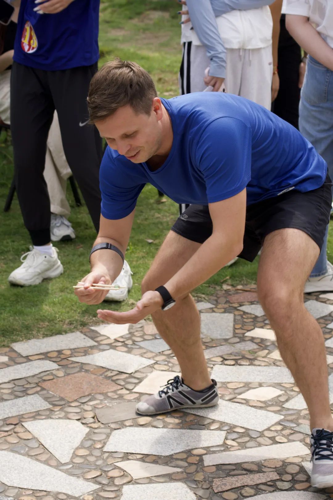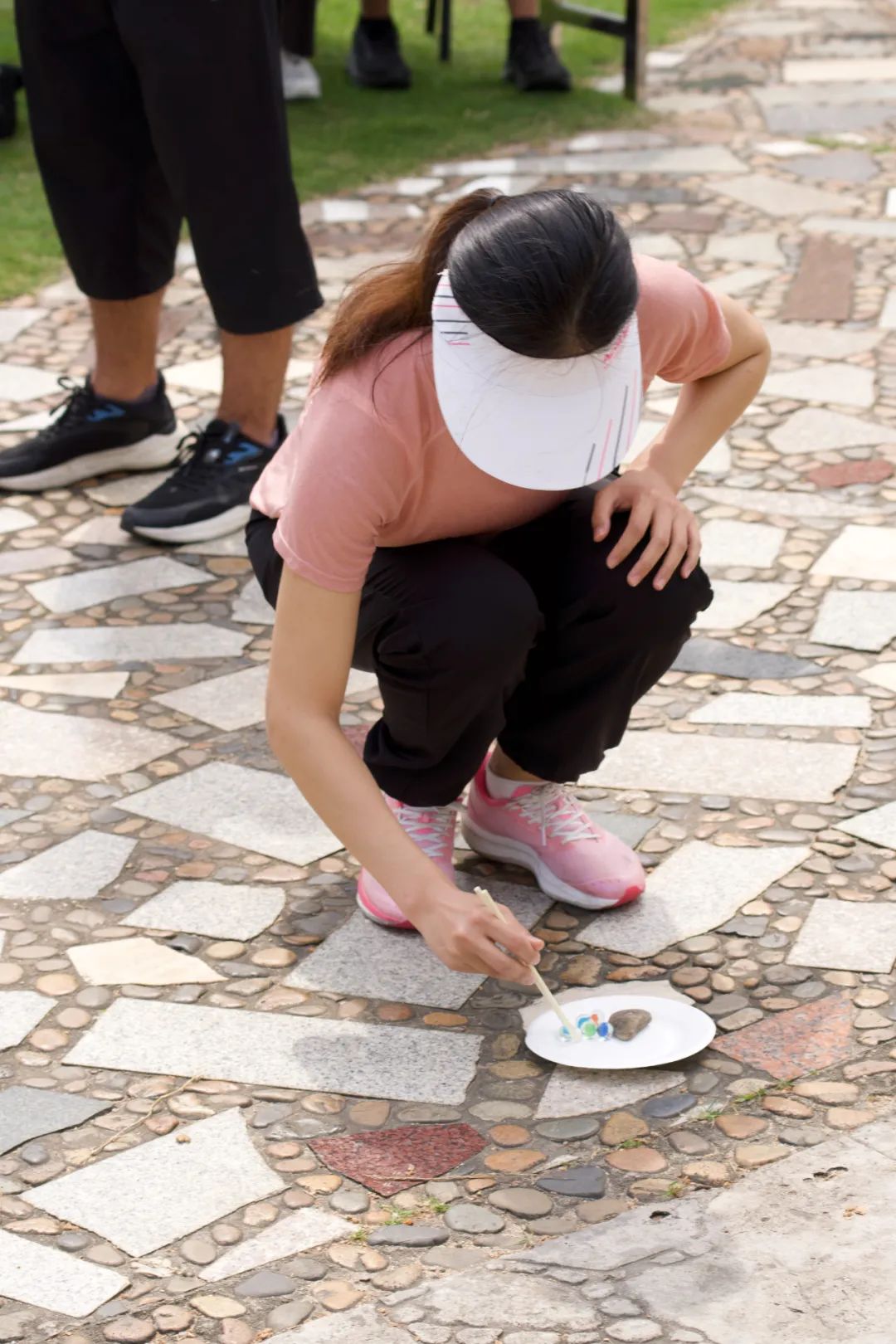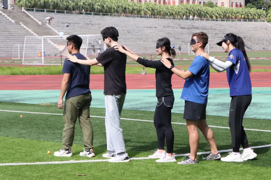 五位队员前后排成一列,每位选手依次将手臂搭在前面选手的肩膀,队首四人蒙住双眼,最后一人指挥队伍前进,并拾起散落在地上的乒乓球。最后一位选手好似团队的眼睛,指引其他选手完成任务,队伍的默契与配合是获得胜利的关键