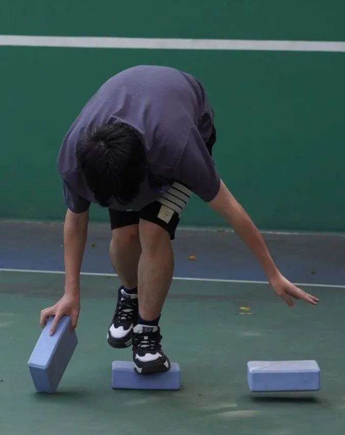 这一关中需要选手们“摸着石头过河”,脚踩三块泡沫砖交替前进,若每位选手身体各个部位沾地次数小于三,即为挑战成功。选手们努力调整肢体形态,在行走过程中保持平衡和身体的协调性。