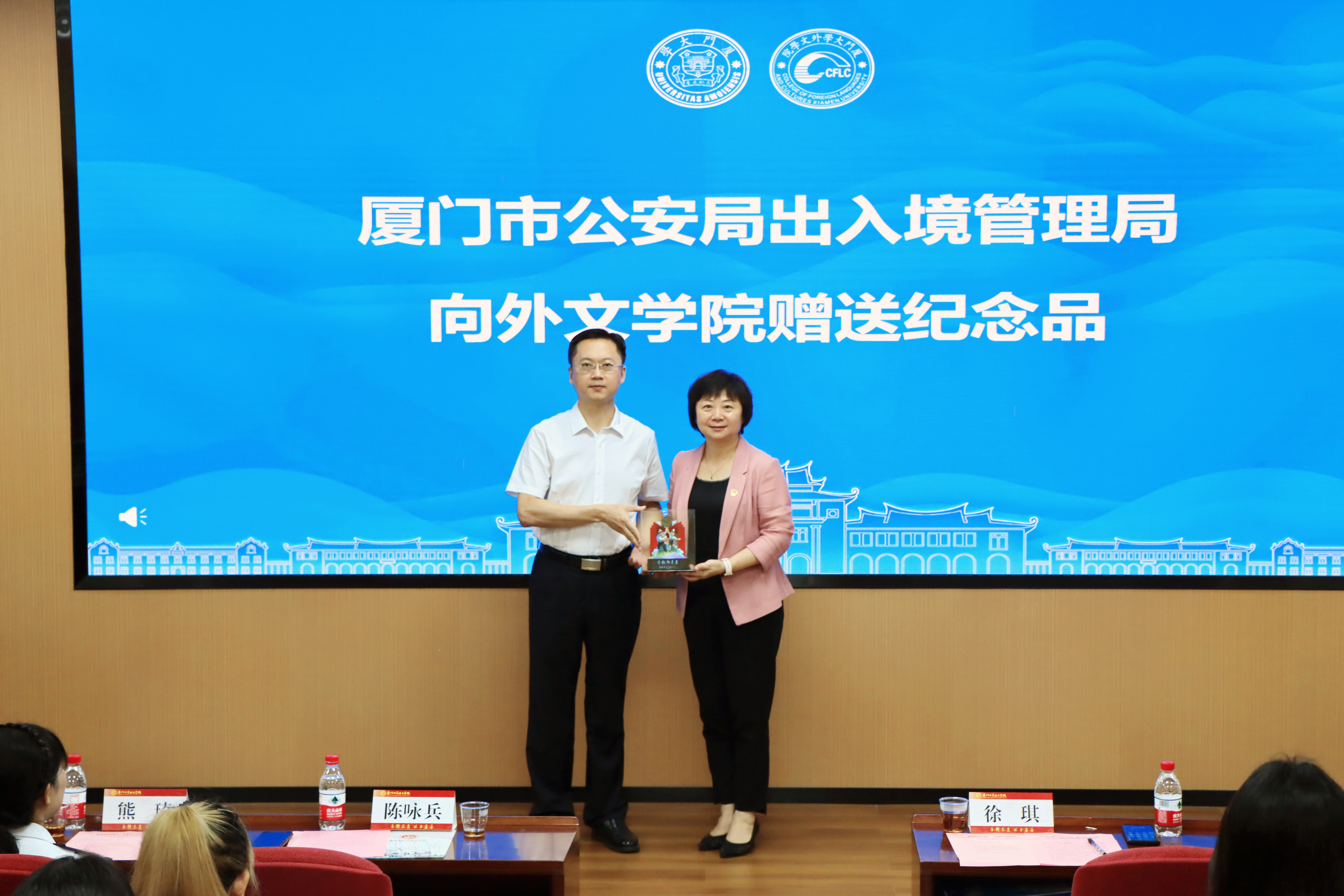 通过三年的友好合作,厦门市公安局出入境管理局与外文学院建立了深厚的情谊。陈咏兵政委代表出入境管理局向外文学院赠送纪念品,表达对外文学院长期支持的感谢。
