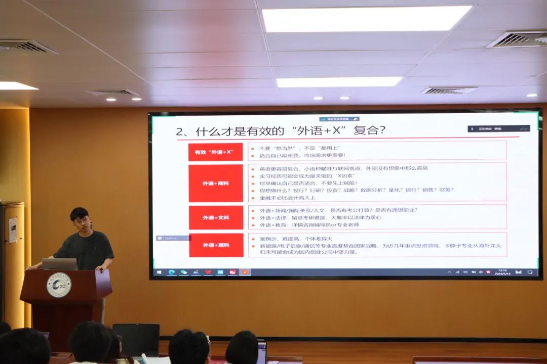 方天靖学长丰富的职场经验让在场的学弟学妹们受益良多,也进一步坚定了同学们对外语学习的信心。相信在优秀院友的引导下,同学们都能扫除困惑,找到适合自己的发展道路,充分发挥好外语的竞争力,积极应对技术新挑战和时代新变化。