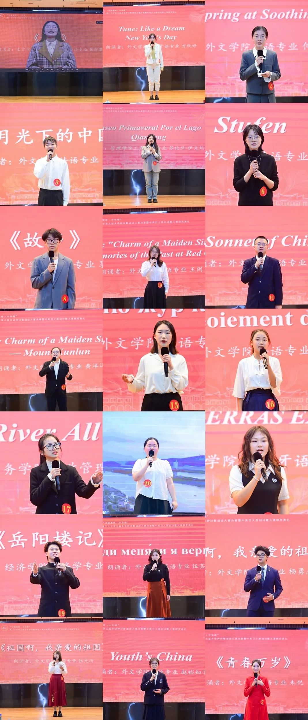 决赛中,选手们用悠扬美妙的诗歌深情讴歌伟大的祖国。75年前,新中国的曙光初现,历经风雨征程,中华民族屹立于世界民族之林。今天,青年学子以青春之力量,触摸历史的心跳,歌颂盛世华章。杨勇杰同学深情朗诵《祖国啊,我亲爱的祖国》,跨越时空的回响,讴歌“甘将热血沃中华”的爱国心、爱国魂。史博文同学用一首《月光下的中国》声情并茂地描绘了月光下的中国的宁静、温柔与强大力量以及古老与现代交织的壮丽图景,以真挚的情感抒发了对祖国的美好愿景。王闽柔同学诵读Tune: "Charm of a Maiden Singer"Memories of the Past at Red Cliff,将对人生变幻无常的潇洒之感抒发得淋漓尽致,传扬着中华民族独有的人文情怀。赵裕知言同学的Youth‘s China表达了广大青年爱国拳拳之心。伍芸萱同学的俄语诗朗«Жди меня́, и я верну́сь»韵律优美,传达了对和平的珍爱。施雨宁同学带来的法语诗«Le rougeoiement du fleuve»激昂慷慨,演绎了作者收复山河的壮志豪情。