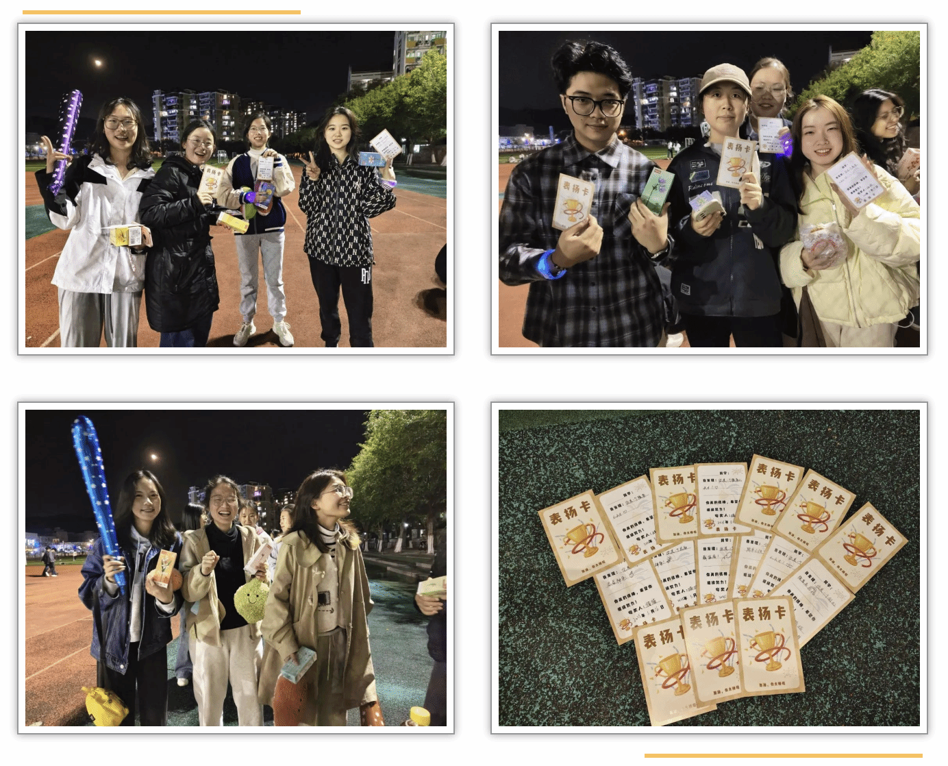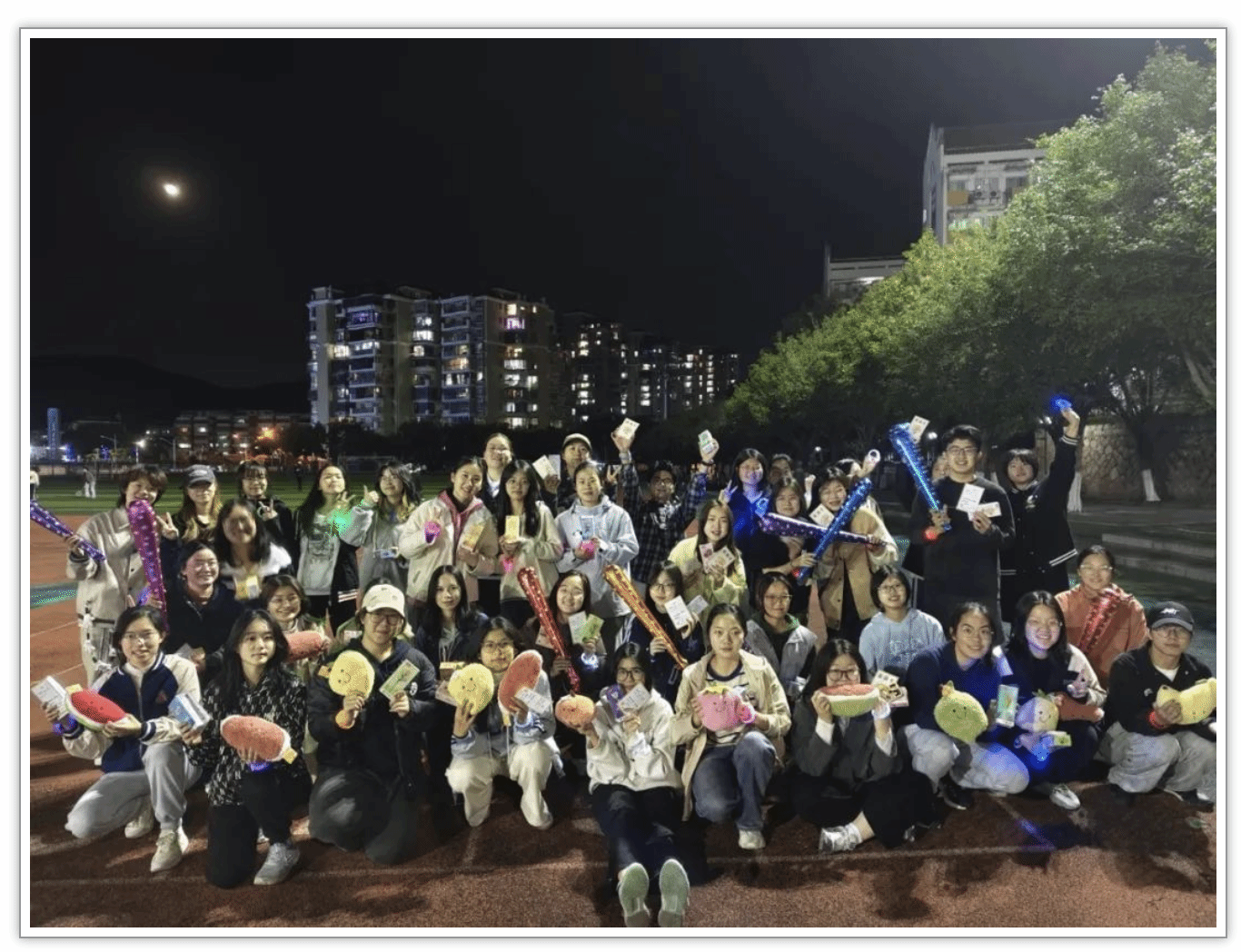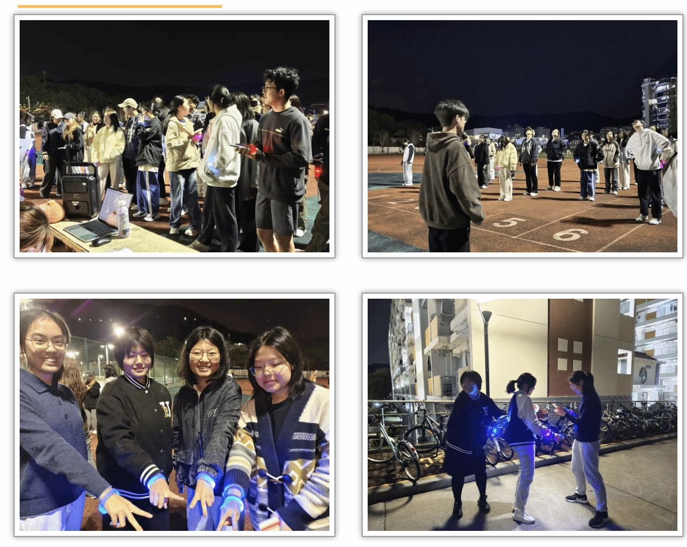 活动当晚19点30分,同学们准时集合,在领取了带有队伍编号的荧光手环和热身之后,迅速进入角色,海韵操场成为了欢乐的起点。游戏开始,“猫猫”方严阵以待,而“鼠鼠”方则争分夺秒地寻找绝佳藏匿点。5分钟的躲藏时间过后,“猫猫”们凭借团队协作,在规定区域内展开紧张刺激的抓捕,部分“鼠鼠”们陆续被找到,而那些机智躲避的“鼠鼠”们,在抓捕时间结束后,也纷纷显露出他们的踪迹。大家尽情奔跑,巧妙躲藏,用智慧和勇气展现了青春的活力。