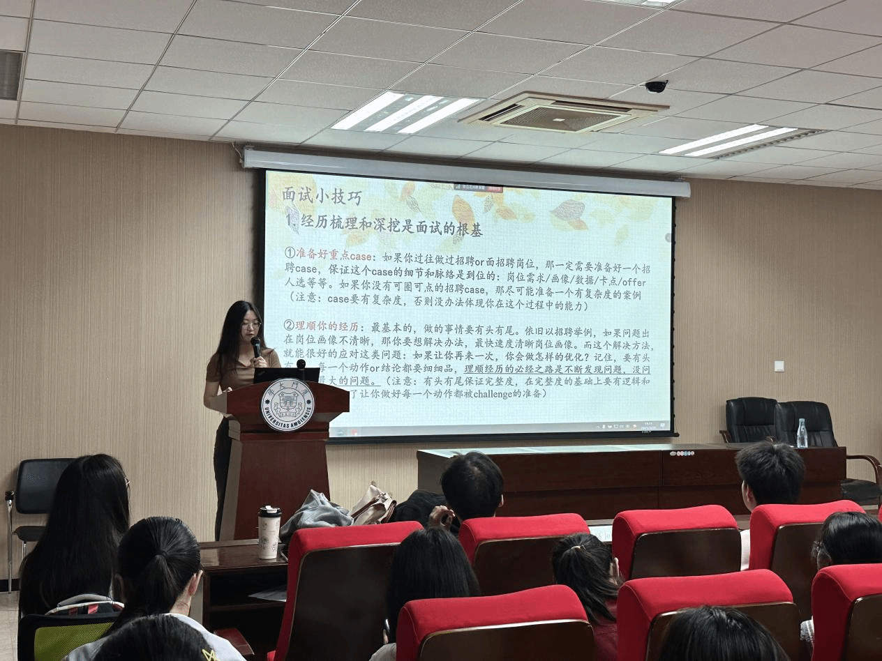 分享会伊始,惠扬从要不要实习、如何找实习和面试技巧等三个板块展开分享。谈及“要不要实习”,惠扬结合自身实习经历,深入剖析实习利弊,向同学们分享实习选择的关键策略。她建议同学们充分评估个人需求,依据自身专业背景与职业规划,寻找合适的实习渠道。同时,惠扬鼓励大家勇敢探索跨专业就业的可能性,拓宽职业发展路径。