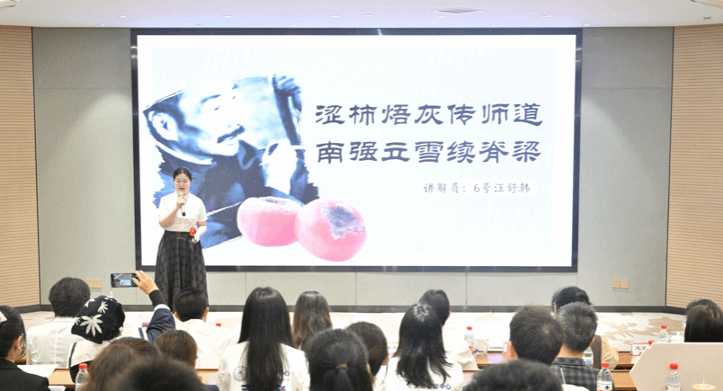 决赛赛场上,汪舒韩同学以《涩柿焐灰传师道,南强立雪续脊梁》为题,带领现场观众走入厦门大学鲁迅纪念馆。她以涩柿的故事为脉络,聚焦鲁迅的师者风范,在生动讲述与严谨表达间找到平衡,让一个鲜活、真实的鲁迅形象跃然眼前,赢得了现场师生的认可与掌声。