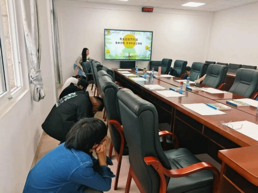 从观树、与自然对话,过渡为与自我对话。丁老师提及,每个人也都像是一颗树,由种子茁壮成长为参天大树,由稚嫩迈向成熟沉稳。活动由语言走向身体动作,同学们在丁老师的指引下,闭上眼睛,先是蜷缩蹲下,想象自己尚是种子,尚在等待,终于等到土壤变得温暖湿润,终于奋力破土而出,同学们的身体也由蹲姿改为弯腰直立,仿佛刚抽出新枝,去向下深深扎根,去汲取营养。“感受阳光,雨露,土壤,空气”,丁老师的声音萦绕耳边,与此同时,大家也都向上张开手臂,去拥抱周围的环境,微微晃动,舒展手臂,迎着丁老师口中的自然的滋润和不时的困难,像是不断发新芽,抽新枝,结新果,沉醉于各自“生命之树”的顶天立地之中。模仿的过程也是一场不言的“自强教育”,从小小种子到参天大树,总有困苦,总有风雨,我们应深深扎根,孜孜努力,有强大的自我,方有开花结果的可能。